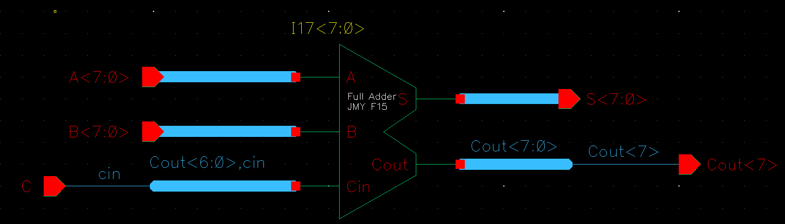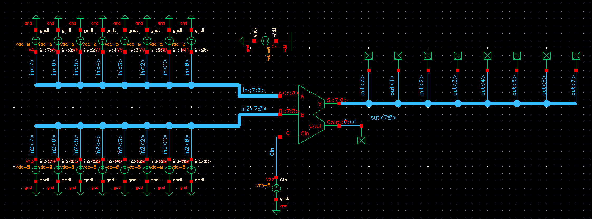 This image is of the simulation schematic to verify functionality of the 8-bit full adder.