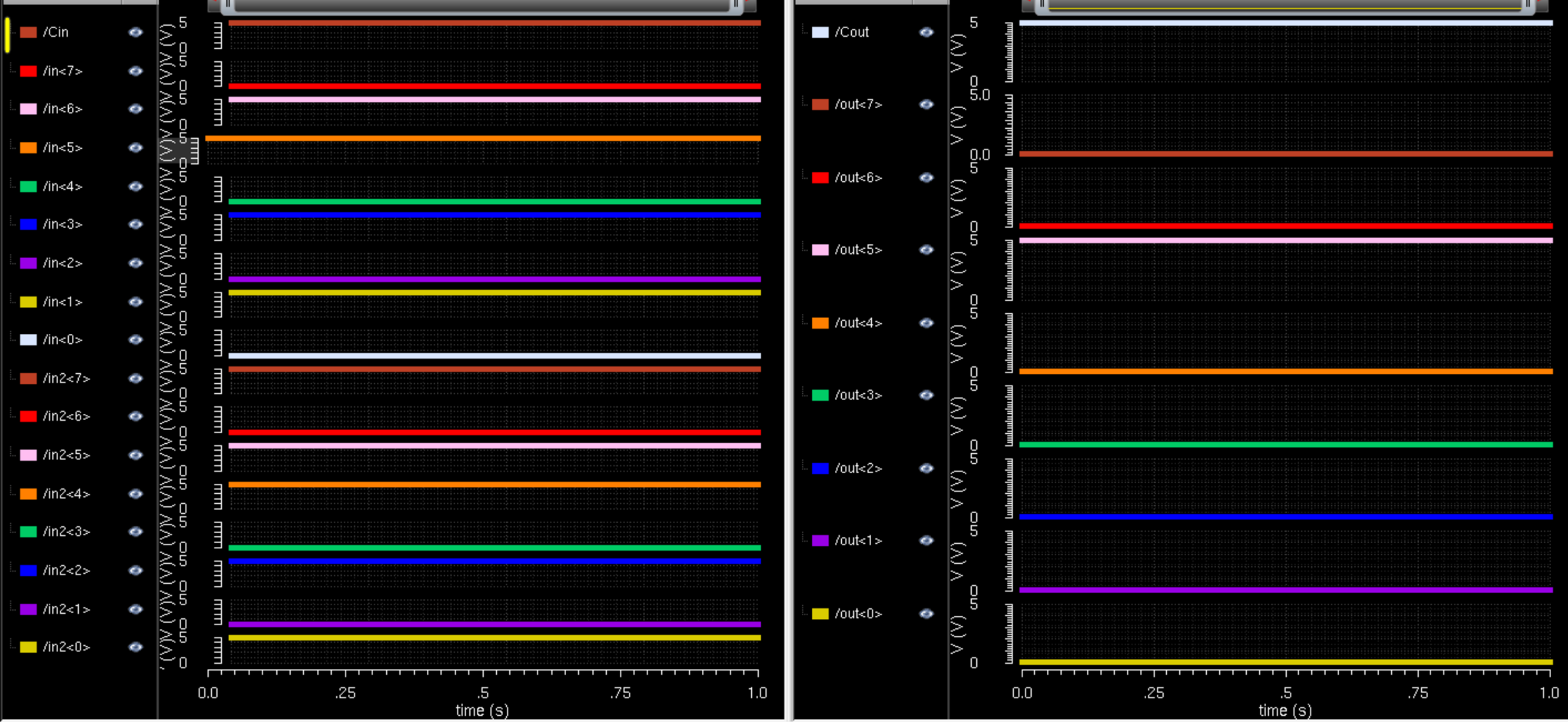 This image is the simulation results produced from the schematic in the previous figure. The sum of 01101010 and 10110101 is 100011111. Along with the Cin, the total is 100100000. Our output has only has Cout high, and out<5> high, indicating a correct output.