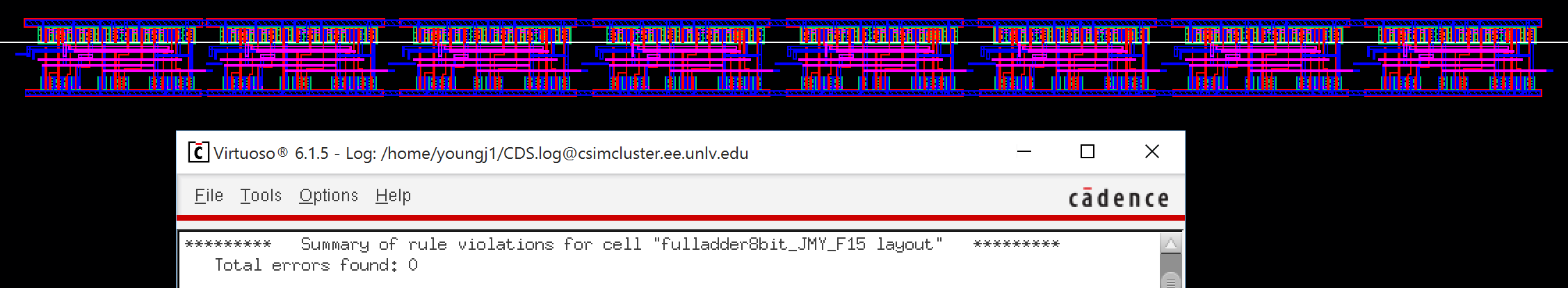 This image shows the layout of the 8-bit full adder and that it has no DRC errors.
