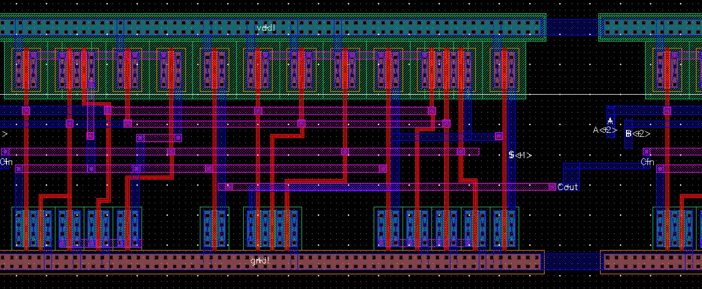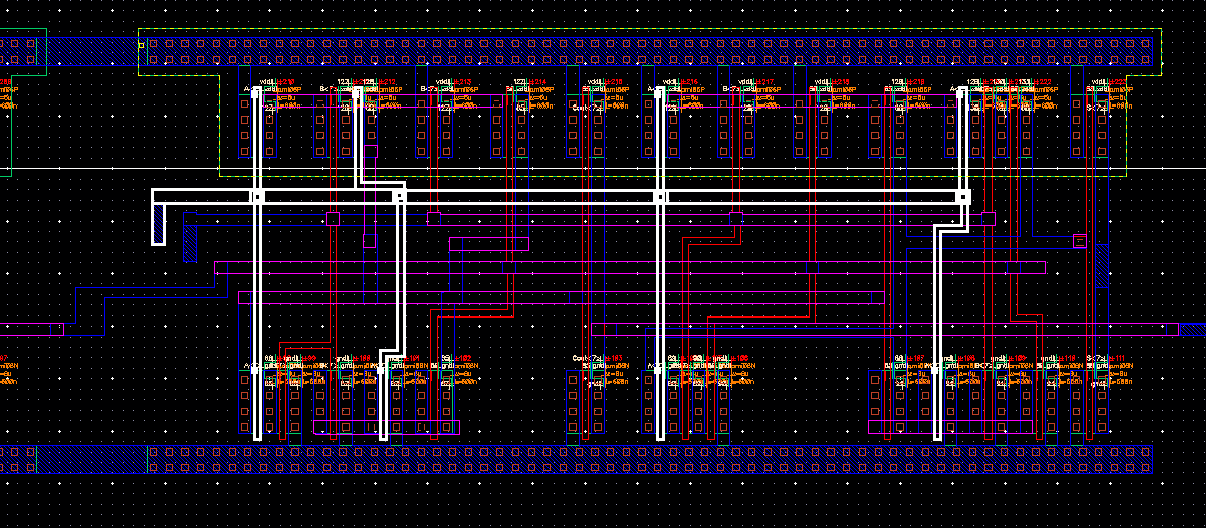 This image shows a close up of the extracted layout of the 8-bit full adder.