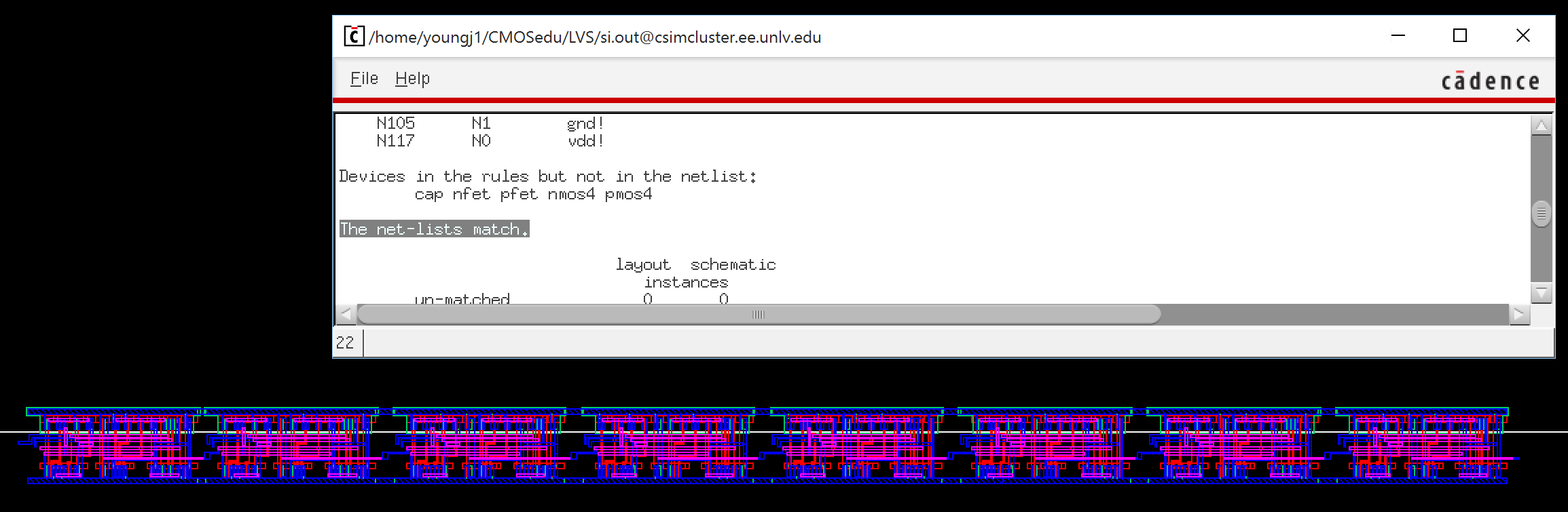 This image shows the extracted layout of the 8-bit full adder and that it has no LVS errors.