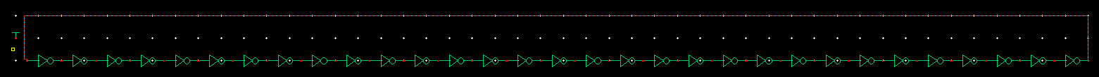 This image shows the schematic layout of a 31-ring oscillator by connecting inverters together in a chain, with the ends connecting back on each other. Note: VDD is used as a stimuli.