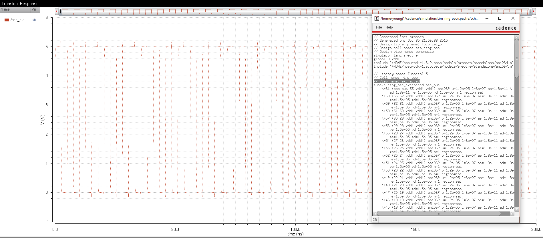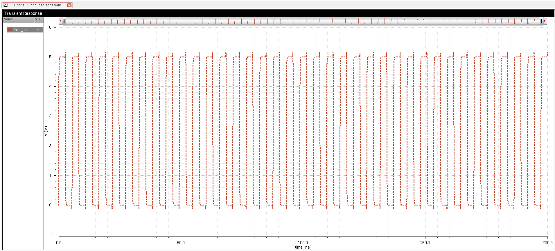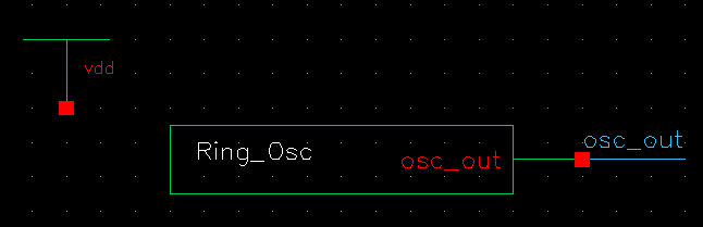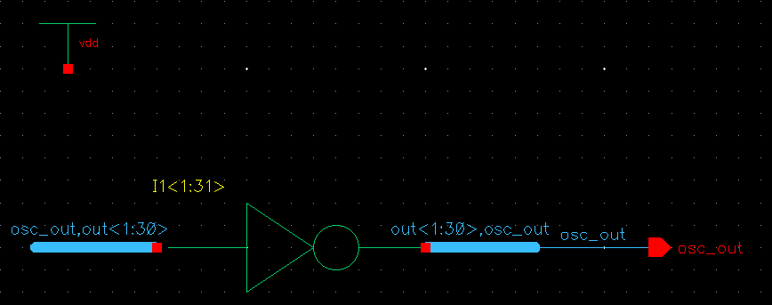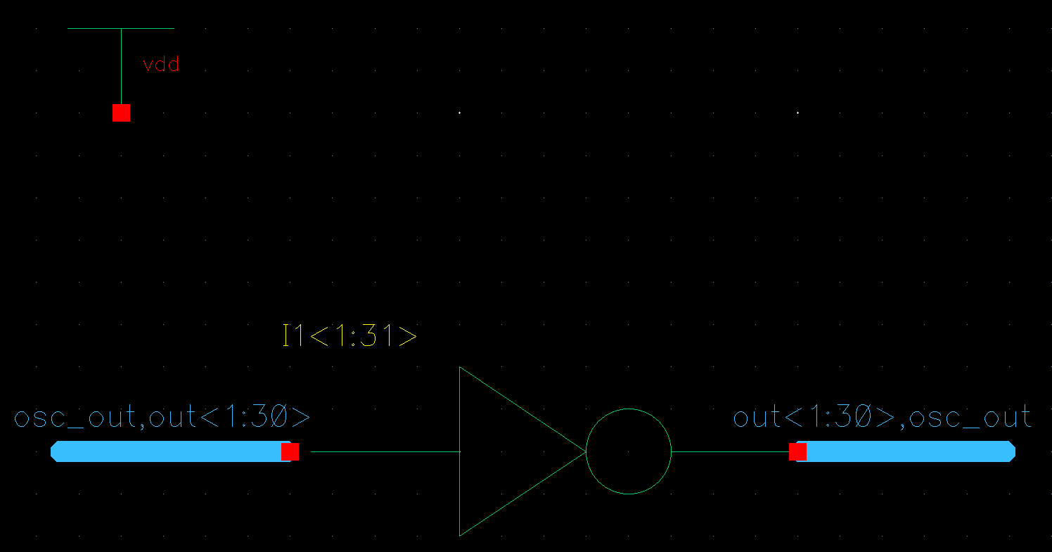 This image shows a 31-ring oscillator using a cleaner schematic. Instead of using 31 inverters connected together, as was done in Figure 1, the inverter here was instantiated 31 times. This allows us to use a bus and array configuration to achieve the same 31-ring oscillator from figure 1. Note: VDD is used as a stimuli.