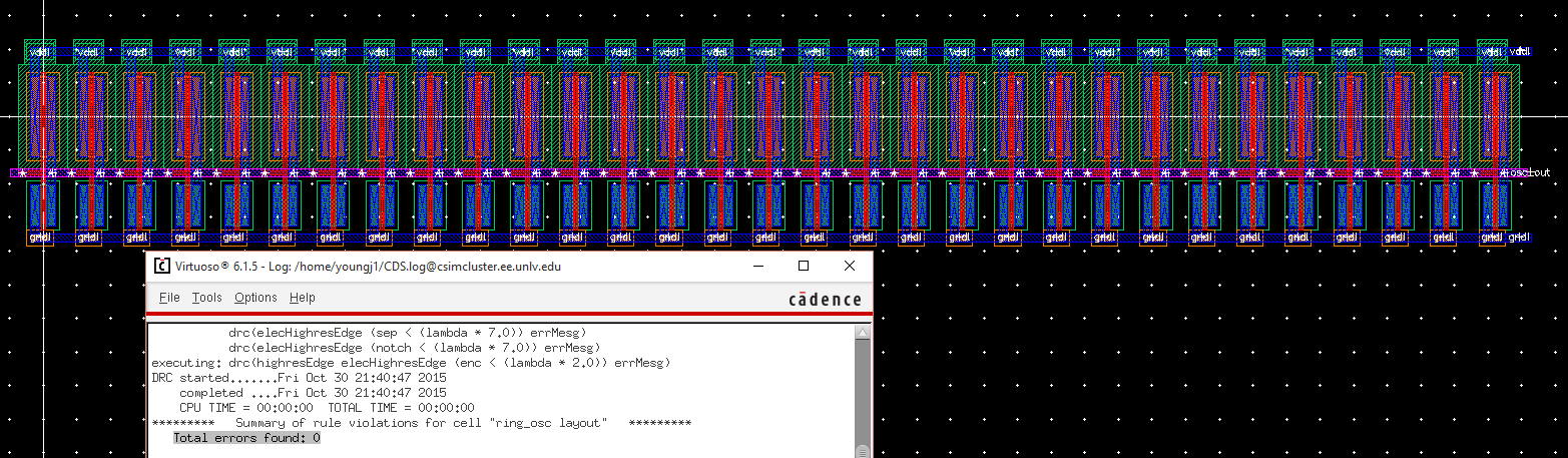 This image shows that the 31-ring oscillator layout passed DRC without any errors.
