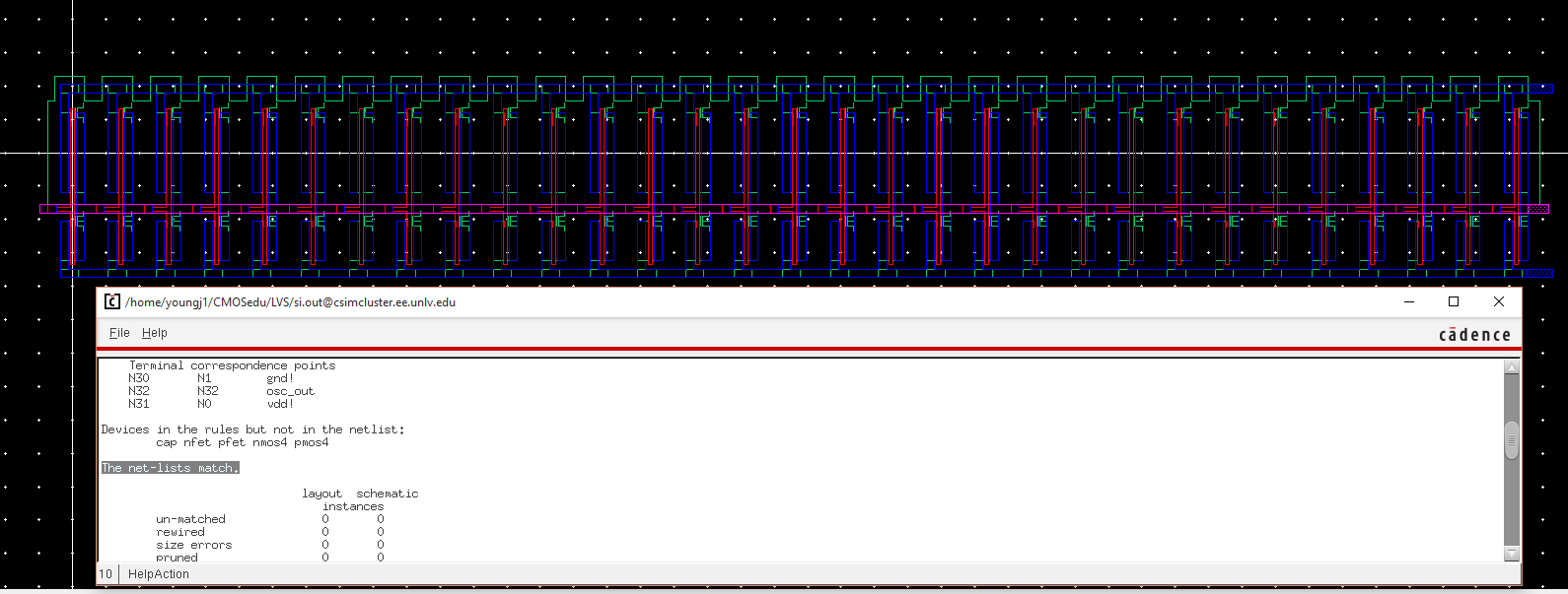 This image shows the extracted 31-ring oscillator layout and that it passed LVS without issues as the netlists match.