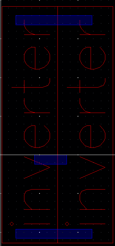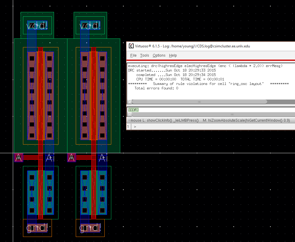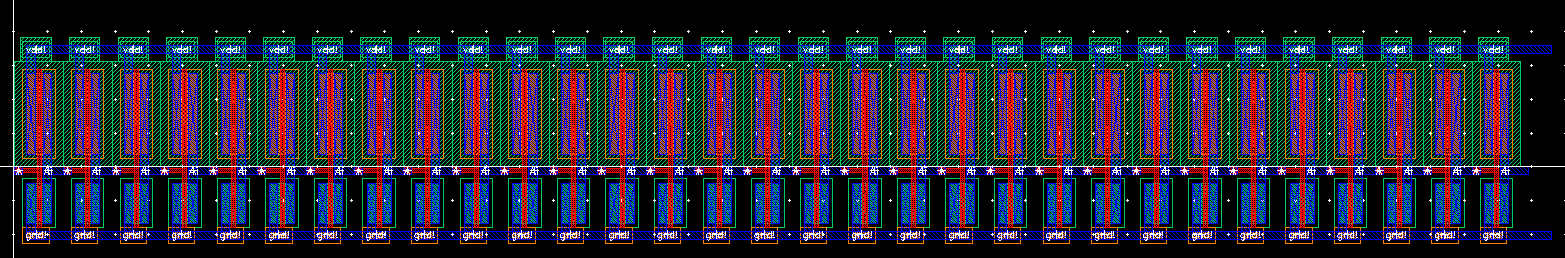 This image shows the layout of two inverters next to each other, for preparation of the 31-ring oscillator layout. Note: DRC returned no errors and thus this design is valid, until checked with LVS to see if it is functionally identical to the schematic.