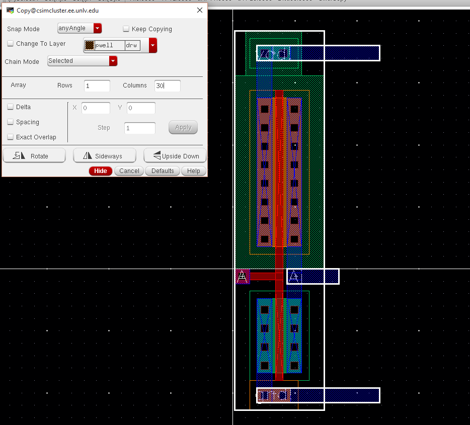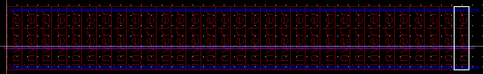 This image shows the layout of a single inverter, being copied 30 times to allow us to create a 31-ring oscillator layout with minimal effort.