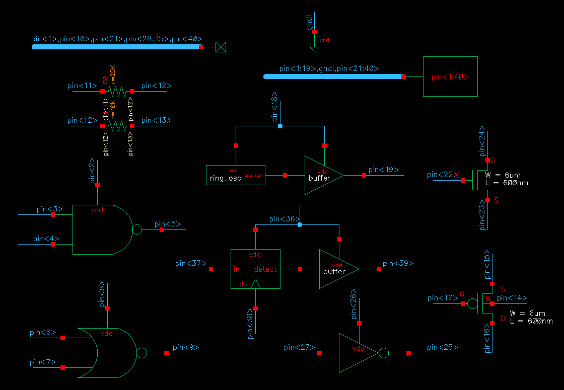- A 25k resistor implemented using the n-well (connect between 2 pads but we also need a common gnd pad)