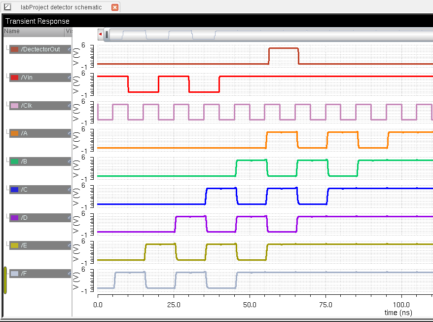Notice that DectectorOut is only HIGH when the output from the shift register is A . B' . C . D' . E . F (1 0 1 0 1 1 ).