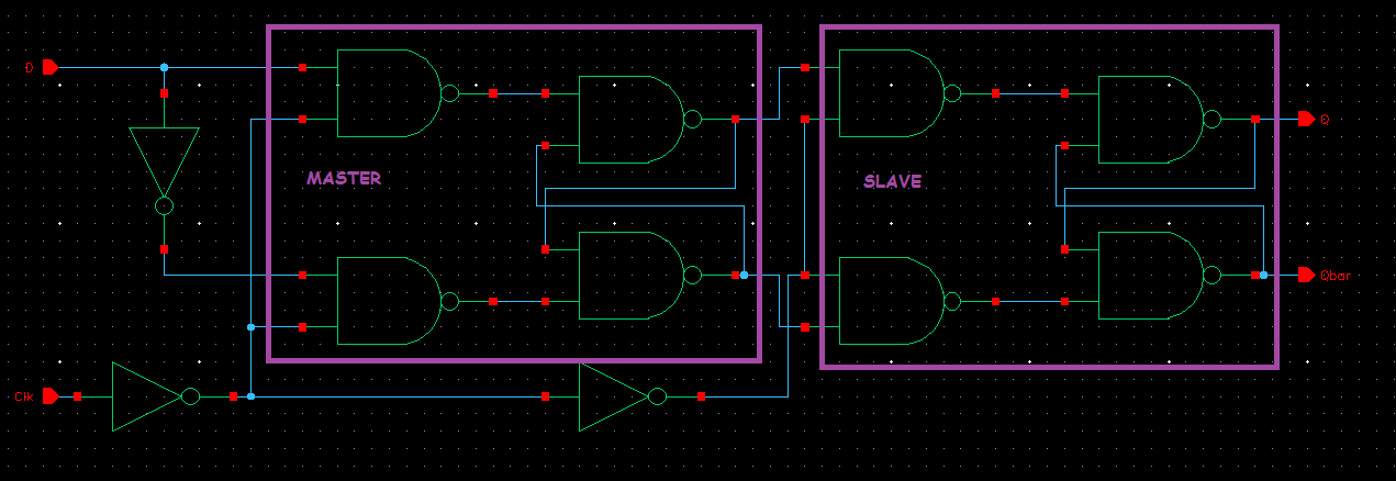 The edge triggered D-FF was created by putting two D-latch