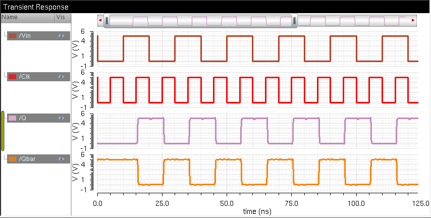Notice that "Q" only "latches" onto the input "Vin" when the clock is at the rising edge. This is the expected behavior of this component.