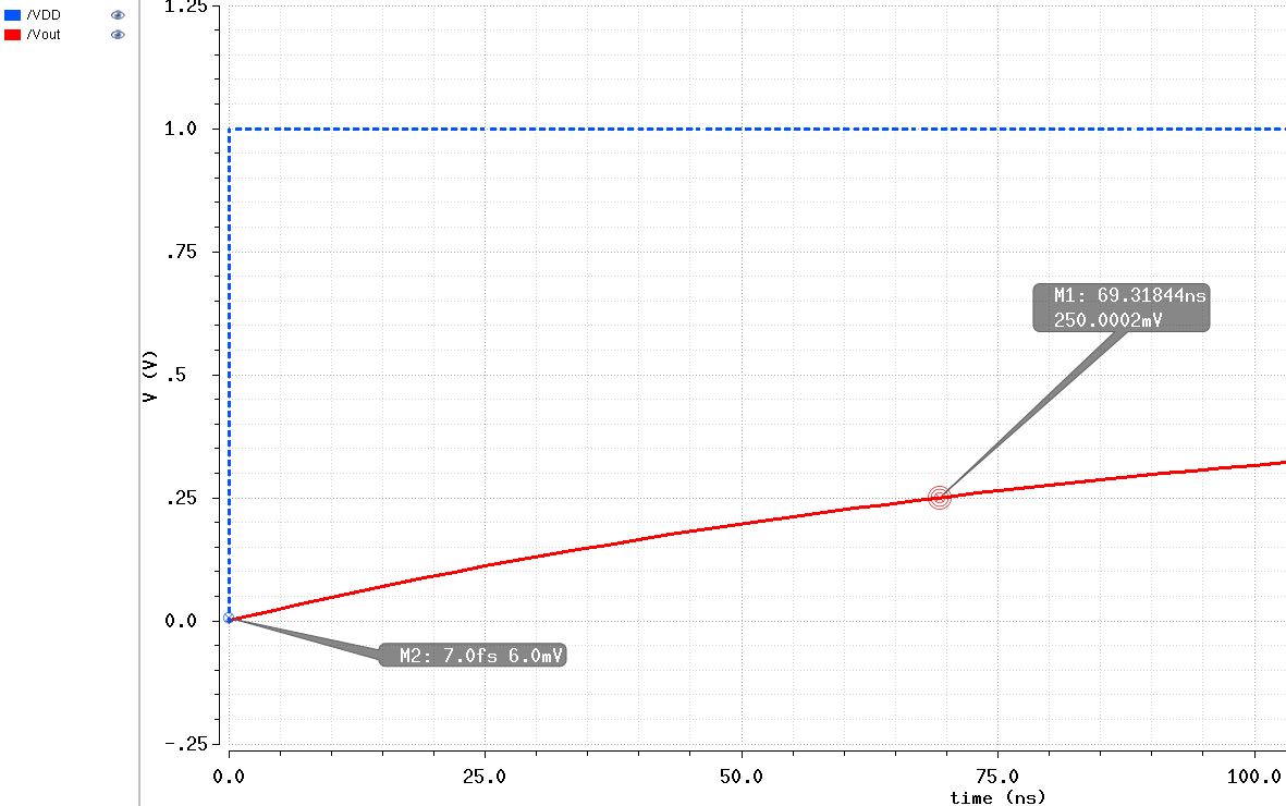 Having calculated the output resistance of 10kΩ, it can be used to calculate the rise time for a step change in the DAC output. Using a capacitive load of 10pF the time for a 50% rise should be .7RC or .7*10kΩ*10pF = 70ns. This result is confirmed in simulation (click either image for full size):
