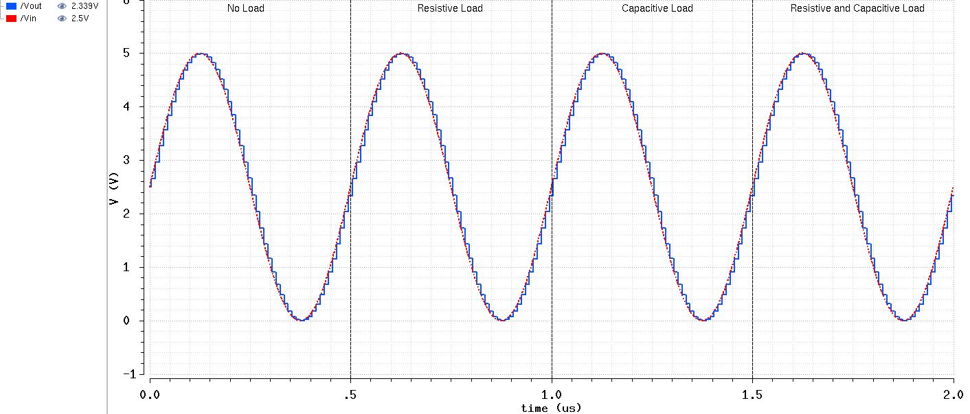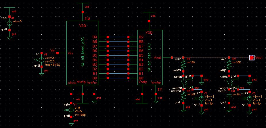 As instructed, for the prelab I downloaded, added to Cadence, and began to look at the lab2 library. In the sim_Ideal_ADC_DAC cell there is an alternating current source that drives the input of an analog-to-digital converter (ADC) with parallel outputs that drive the parallel inputs of the DAC. This causes the sinusoidal input signal from the AC to converted into a stair step output that reasonably approximates the input as shown below: