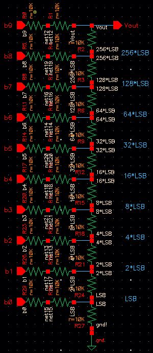 To calculate the least significant bit (LSB) of a DAC the full scale range of the output is divided by the total number of bits minus one (to account for a value of zero). Assuming a full scale range of 5V a 1-bit DAC has an LSB of 5V, a 2-bit DAC has an LSB of 1.67V, and so on. The 10-bit DAC I am to design will have an LSB of 4.9mV when it has a full scale range of 5V as shown by these calculations: