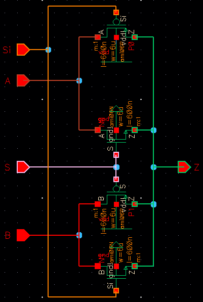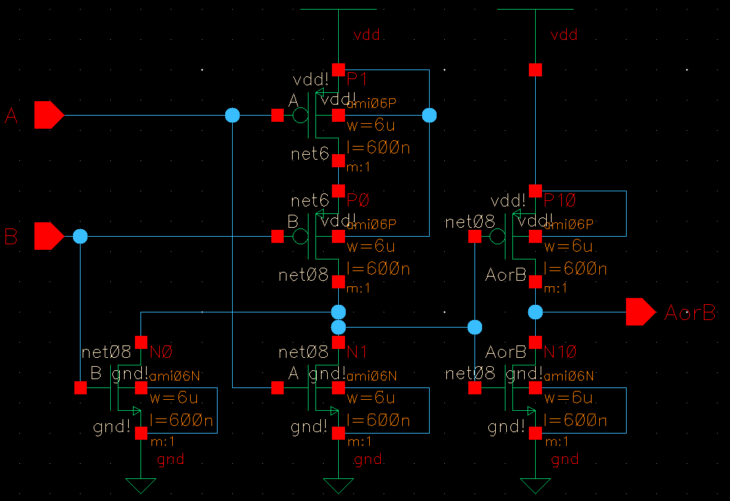 I then built a NAND, NOR, AND, and OR gates as well as a 2-to-1 demux and made them into an 8-bit devices. NOTE: the rest of my simulations were done using Stimuli instead of a specific simulation schematic.