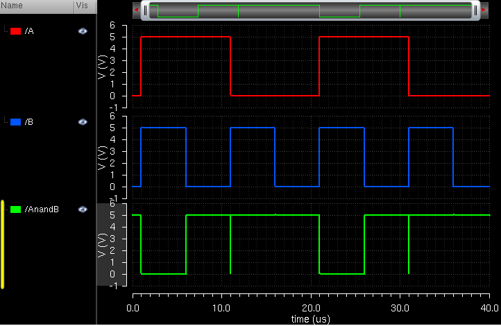 graph proves that the NAND gate works as intended. The output has a little glitch