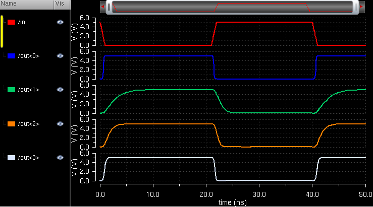 load (out<0>) has a relatively sharp rise and fall time compared to the