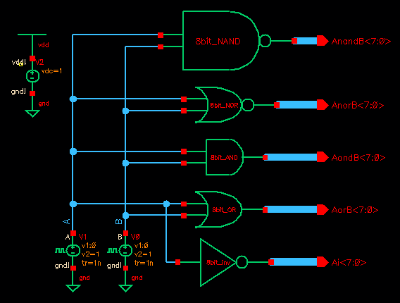 finishing the 8-bit gate arrays, the student created a simulation schematic to