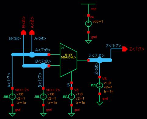created a simulation schematic to test out the 8-bit DEMUX/MUX symbol.