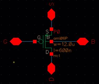 Lay out a 12u/0.6u PMOS device and connect all 4 MOSFET terminals to