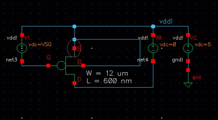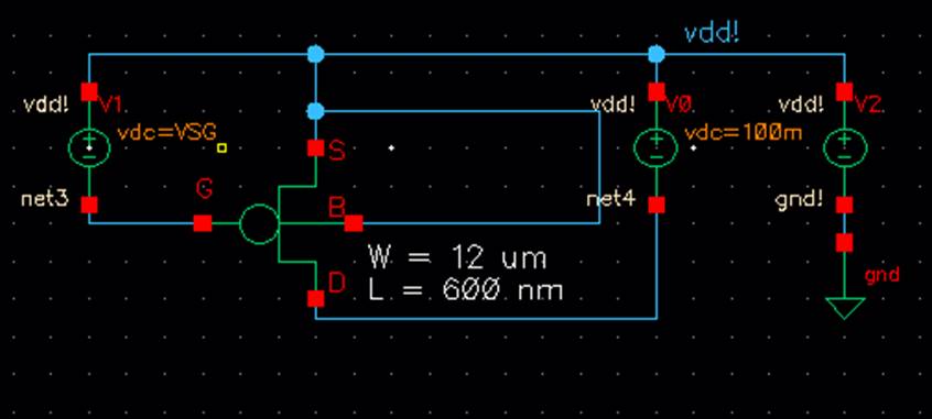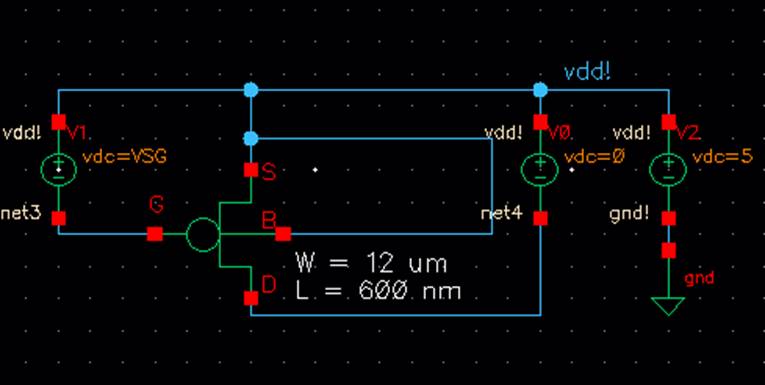 4.) A schematic for simulating ID v. VSG of a PMOS device for VSD = 100