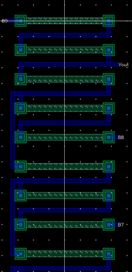 layout of the 10-bit DAC I designed and simulated in Lab 2.