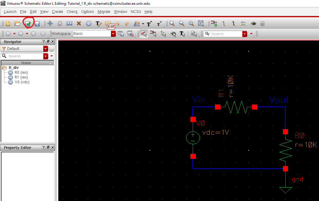 Create the schematic shown below using the tools under the 'Create' tab such as 'Instance' to select components and 'Wire'