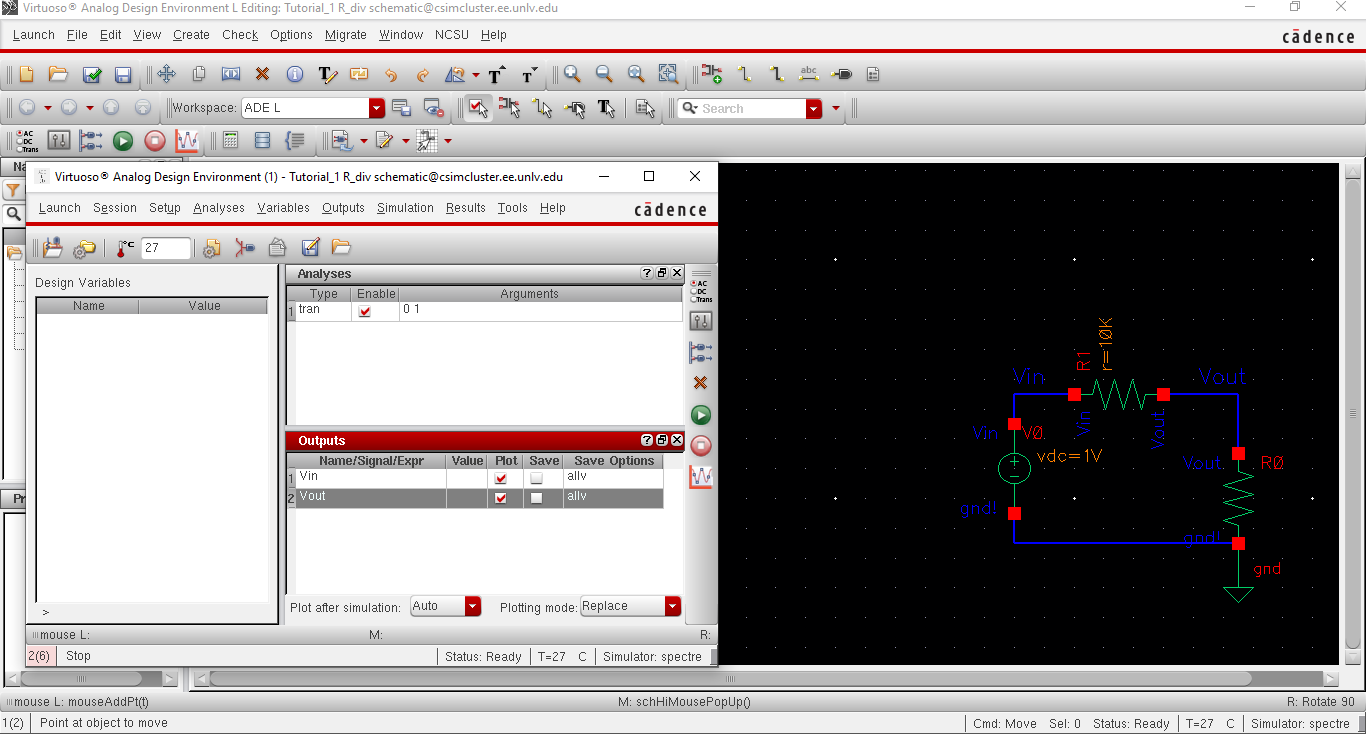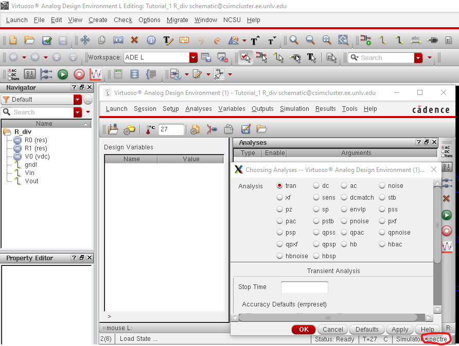 We then go to 'Launch' and in the ADE window we click 'Analyses' -> 'tran'for a transient analysis and