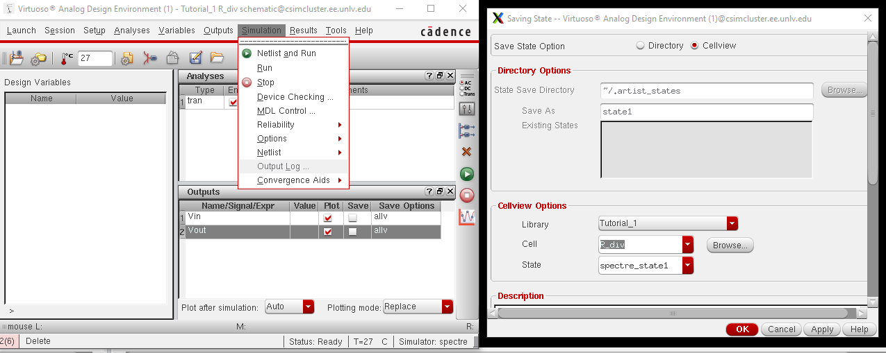 Then in the ADE we want to go to 'Session' -> 'Save State' -> 'Cellview' then press 'Ok' to save our progress.