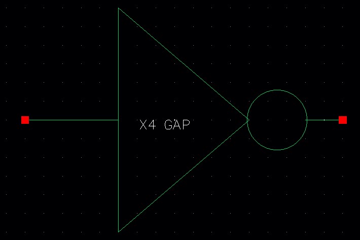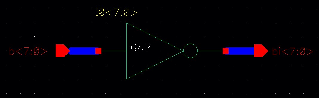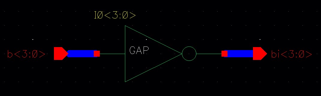 Make an equivalent, more concise, schematic by instantiating an inverter and naming the inverter using an arrayed name (I0<3:0>).