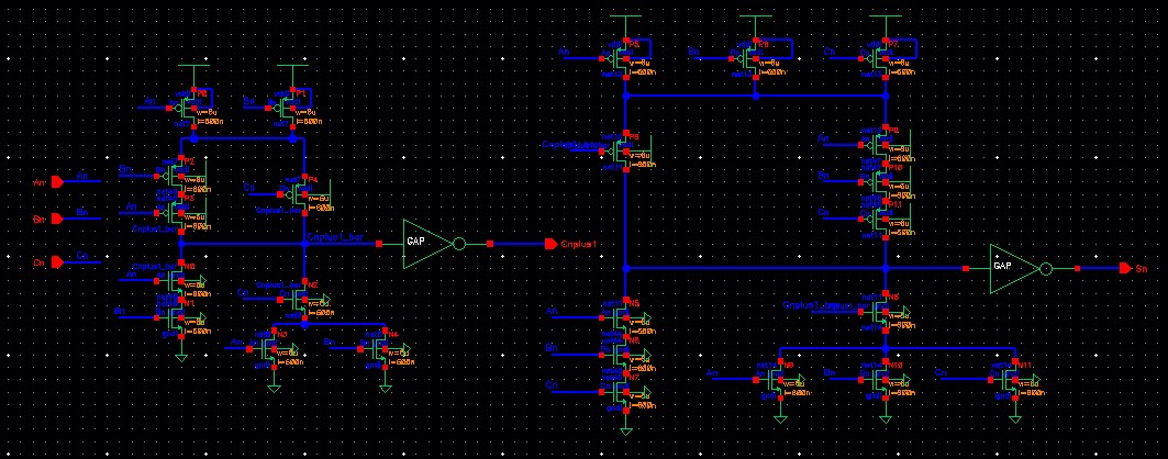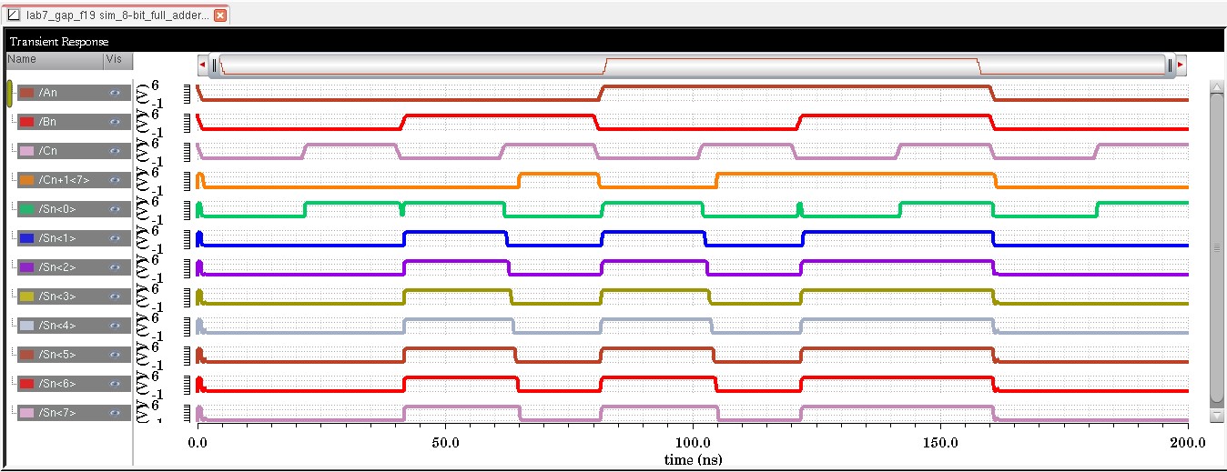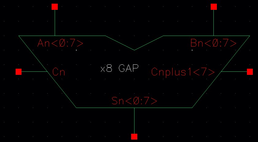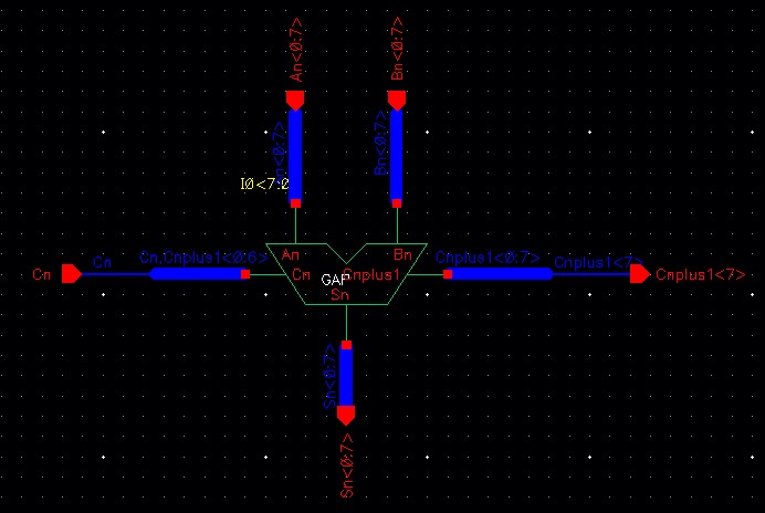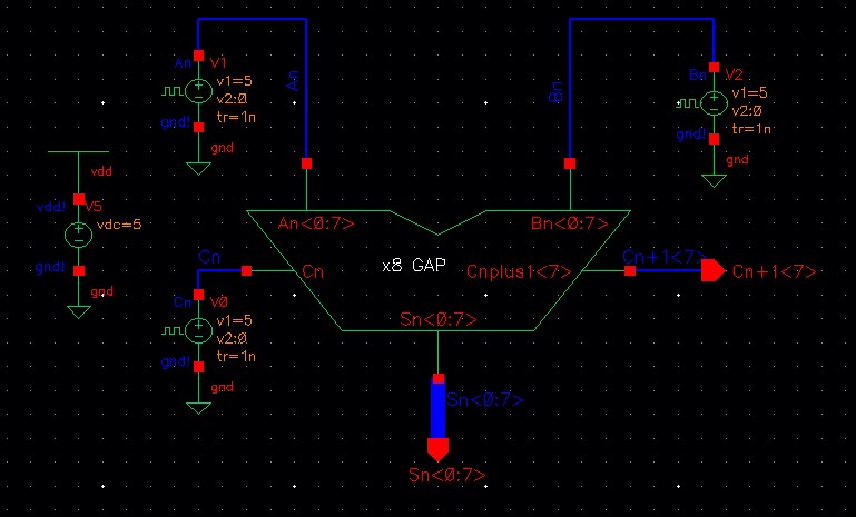 In the above schematic, when A or B are high or low they will have an 8-bit value such as '1111 1111' and '0000 0000', When Cn is high, we can see that the sum (Sn<0:7>) is '0000 0001'. And when A or B are high and nothing else, the sum is '1111 1111'. Then when A and Cn are high or B and Cn are high, the sum is then