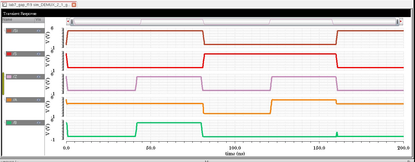And in the DEMUX plot we see that when S is '1' B takes the signal of Z, though A remains '1' at this time. Then when S is '0', A takes the signal ofZ.