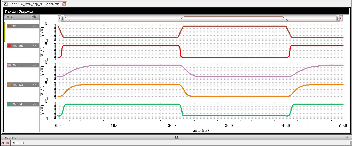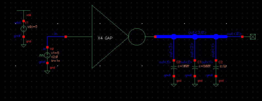 The out<0> is not connected to a load while out<3> is connected to a 100fF load.