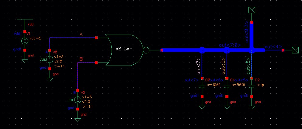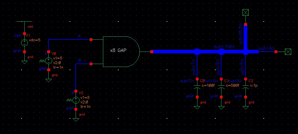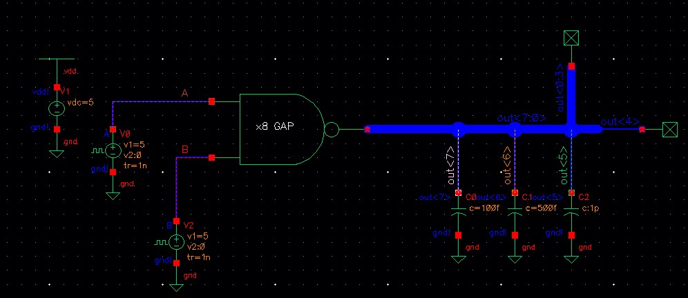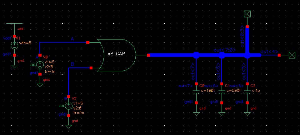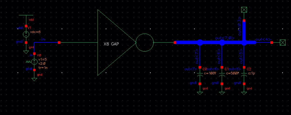 The out<1> is connected to a 1 pF load while out<2> is connected to a 500 fF load.