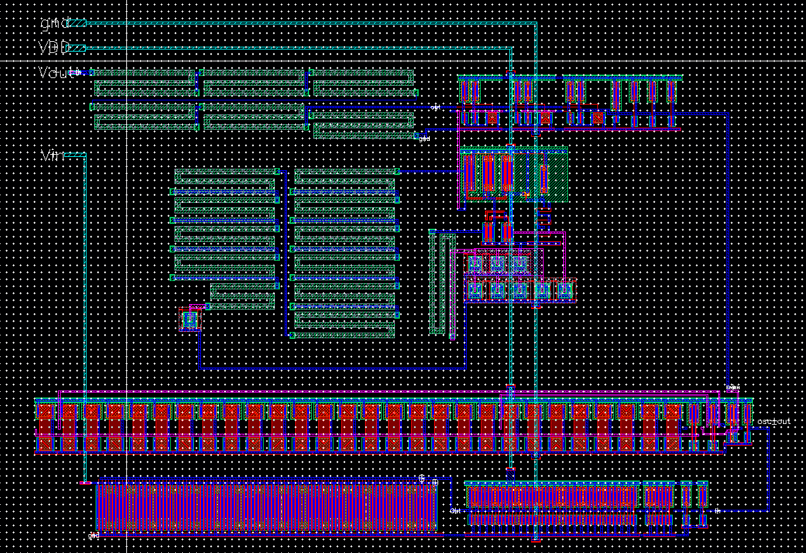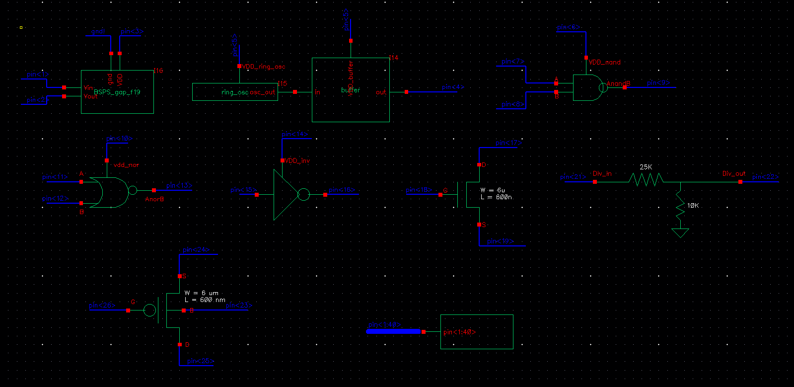 - A 25k resistor implemented using the n-well (connect between 2 pads but we also need a common gnd pad)