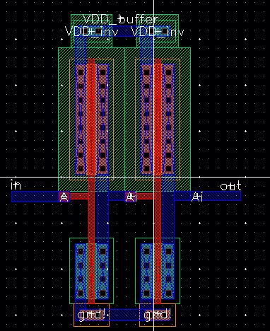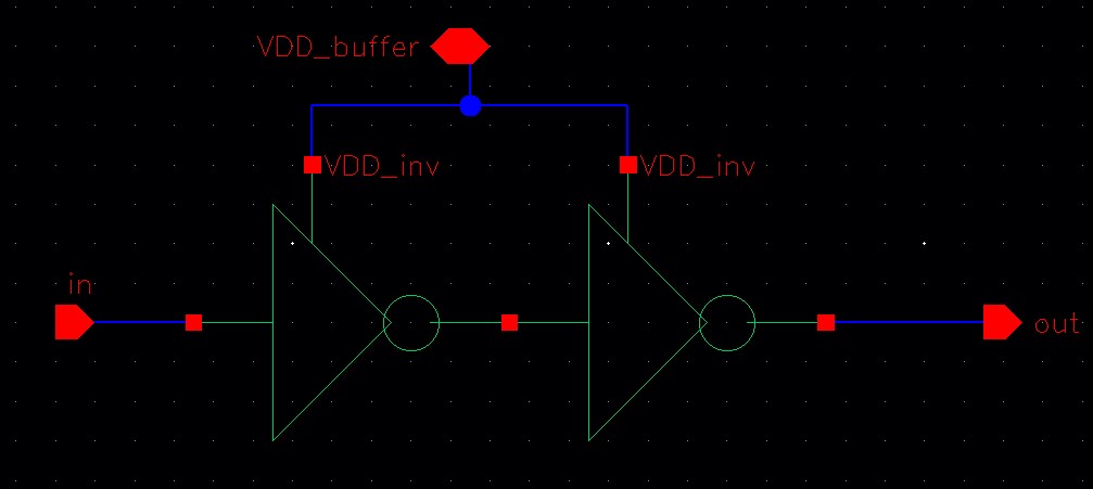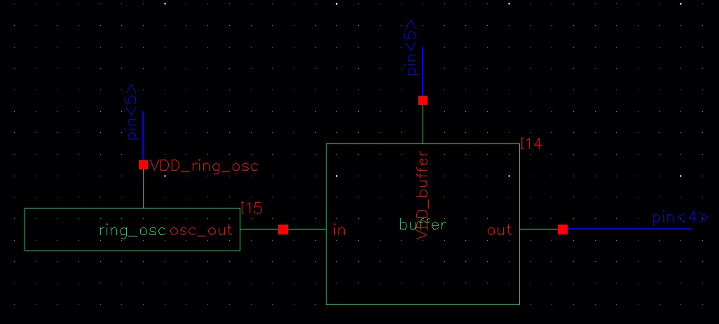 For the ring oscillator with a buffer, both VDDs are connected together at pin<5> and the output to pin<6>.