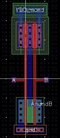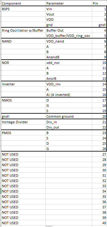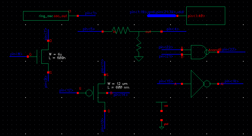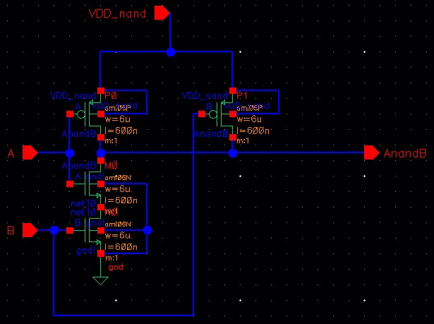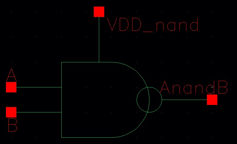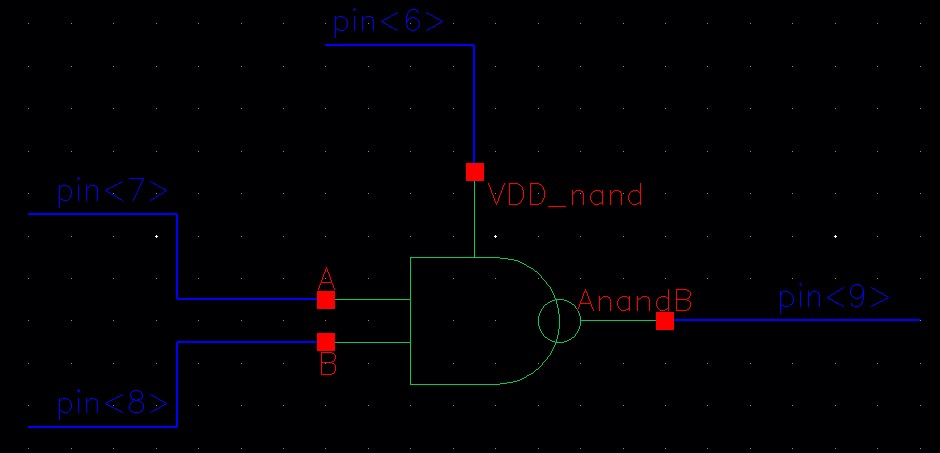 For the NAND gate, VDD is connected to pin<6>, A to pin<7>, B to pin<8> and AnandB to pin<9>.