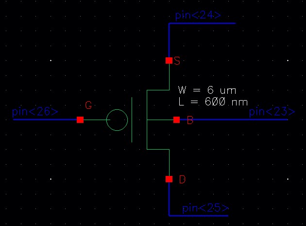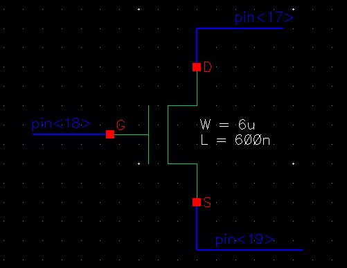 For the NMOS, the drain is connected to pin<17>, the gate to pin<18> and the source to pin<19>.