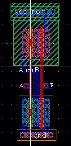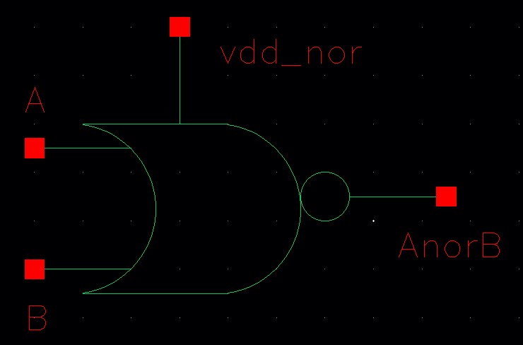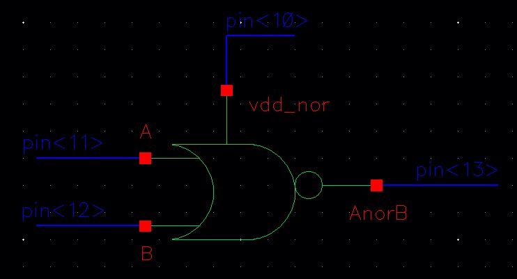 For the NOR gate, VDD is connected to pin<10>, A to pin<11>, B to pin<12> and AnorB to pin<13>.