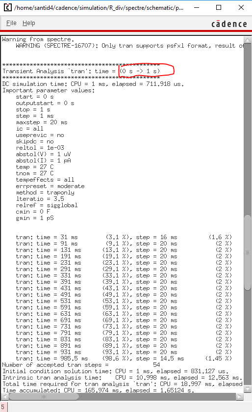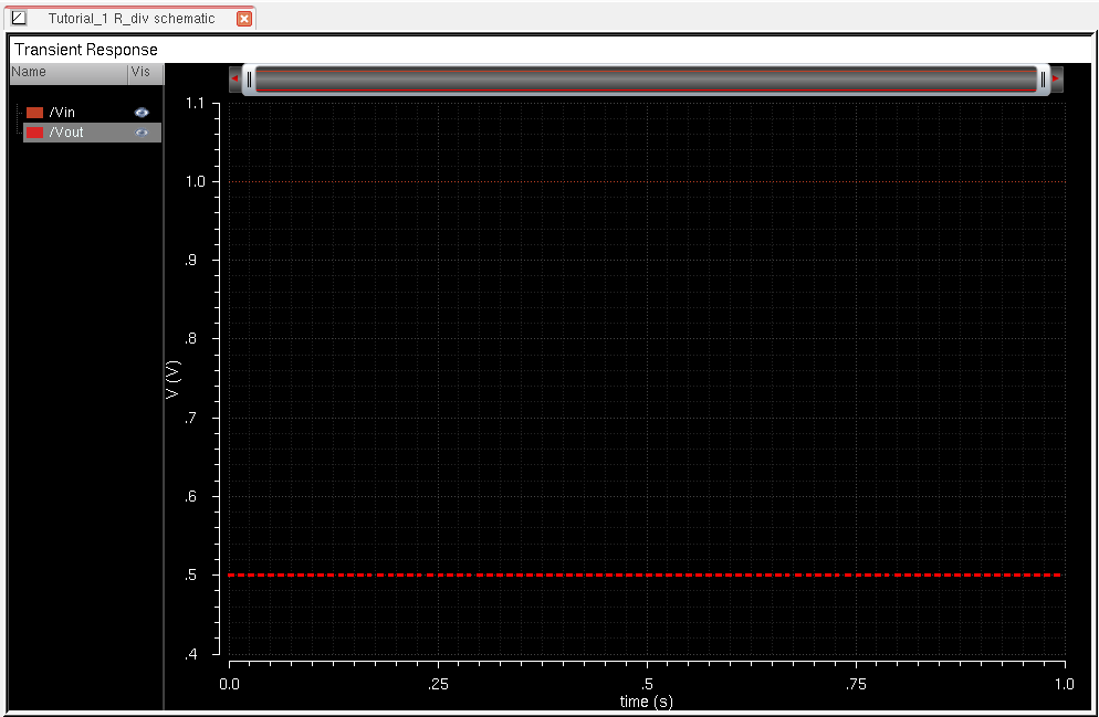 transient simulation of 1 second, and plotting Vin and Vout: