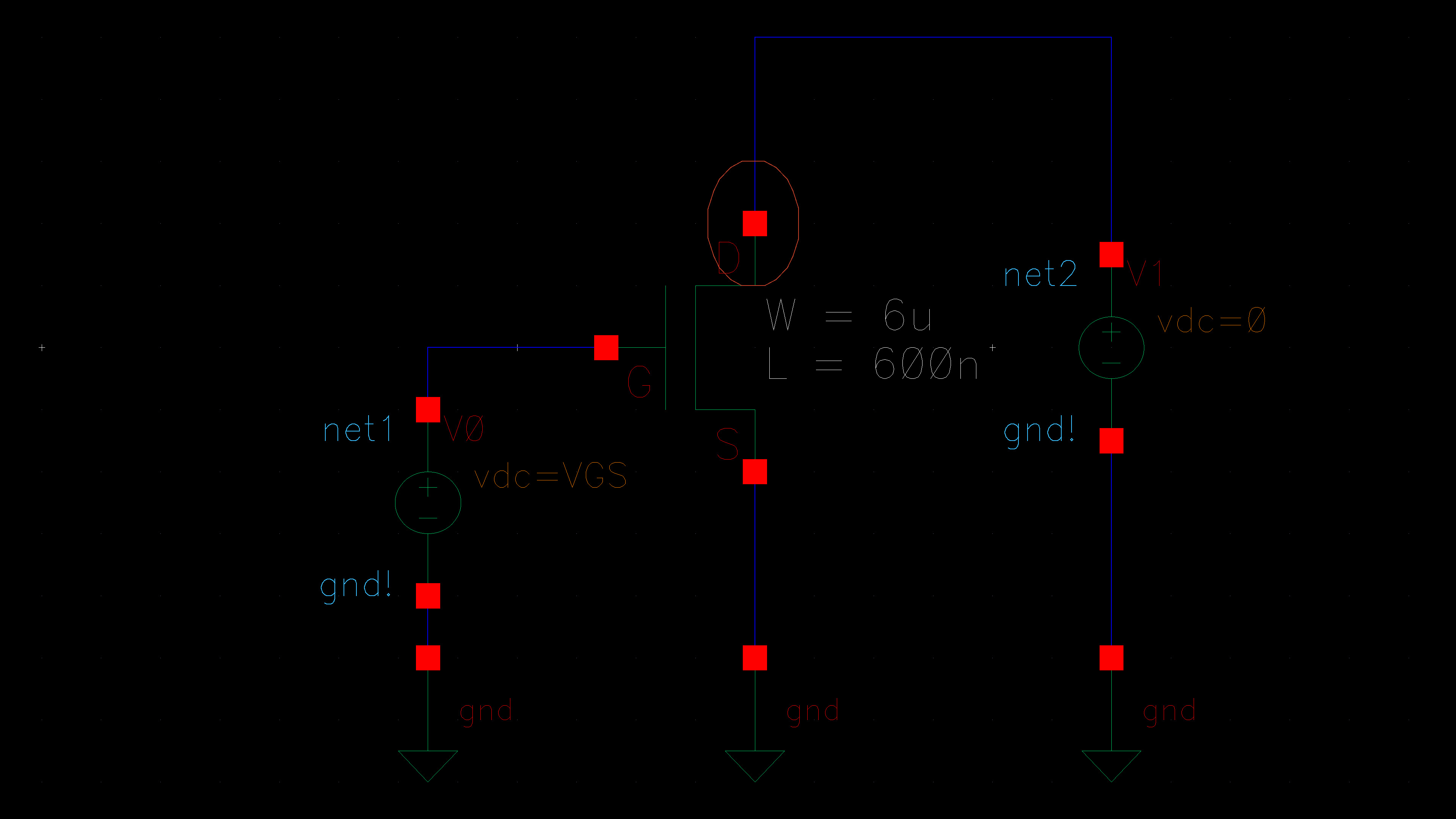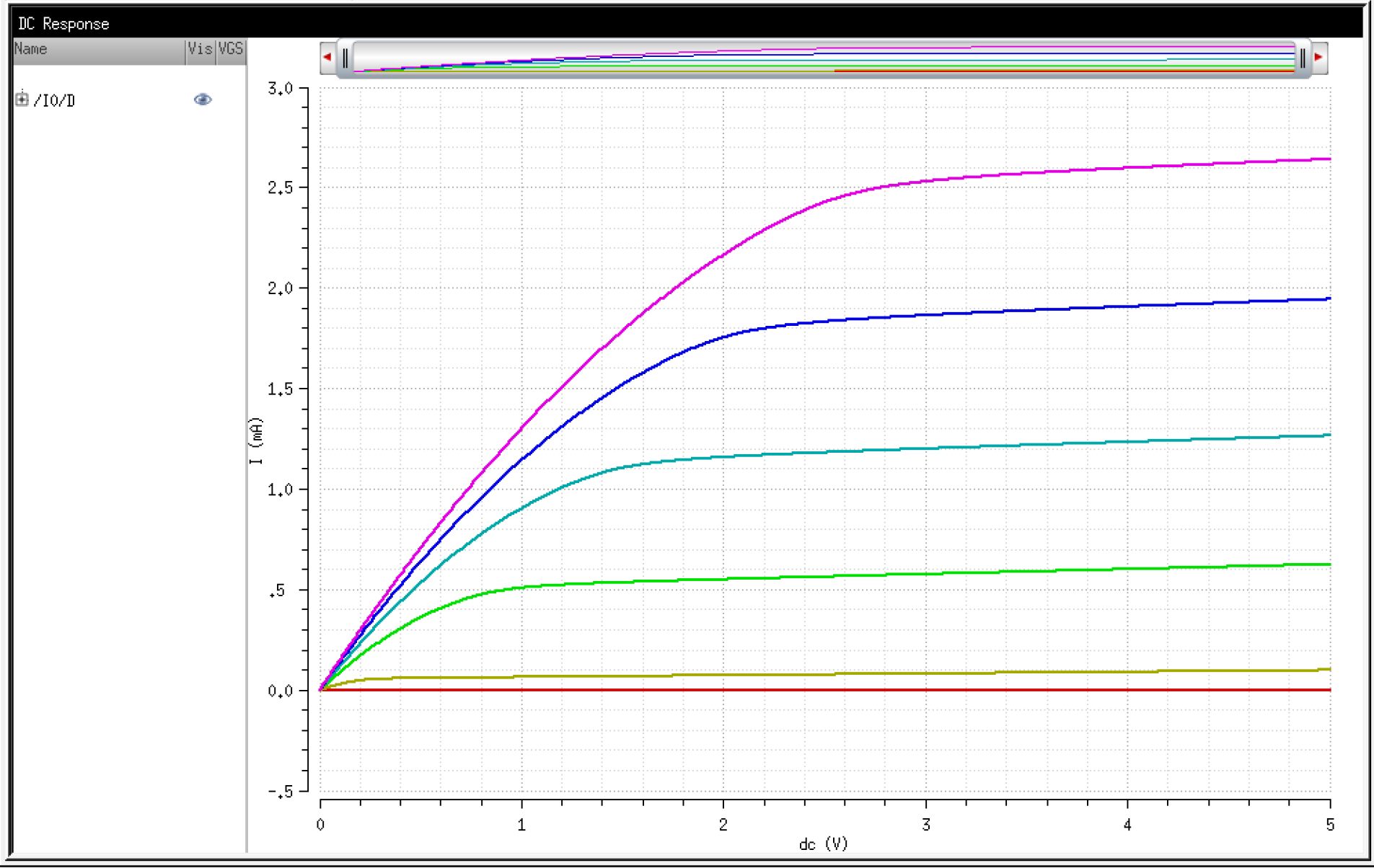 Here, we vary VGS from 0 to 5V in 1V steps while VDS varies from 0 to 5V in 1mV steps.