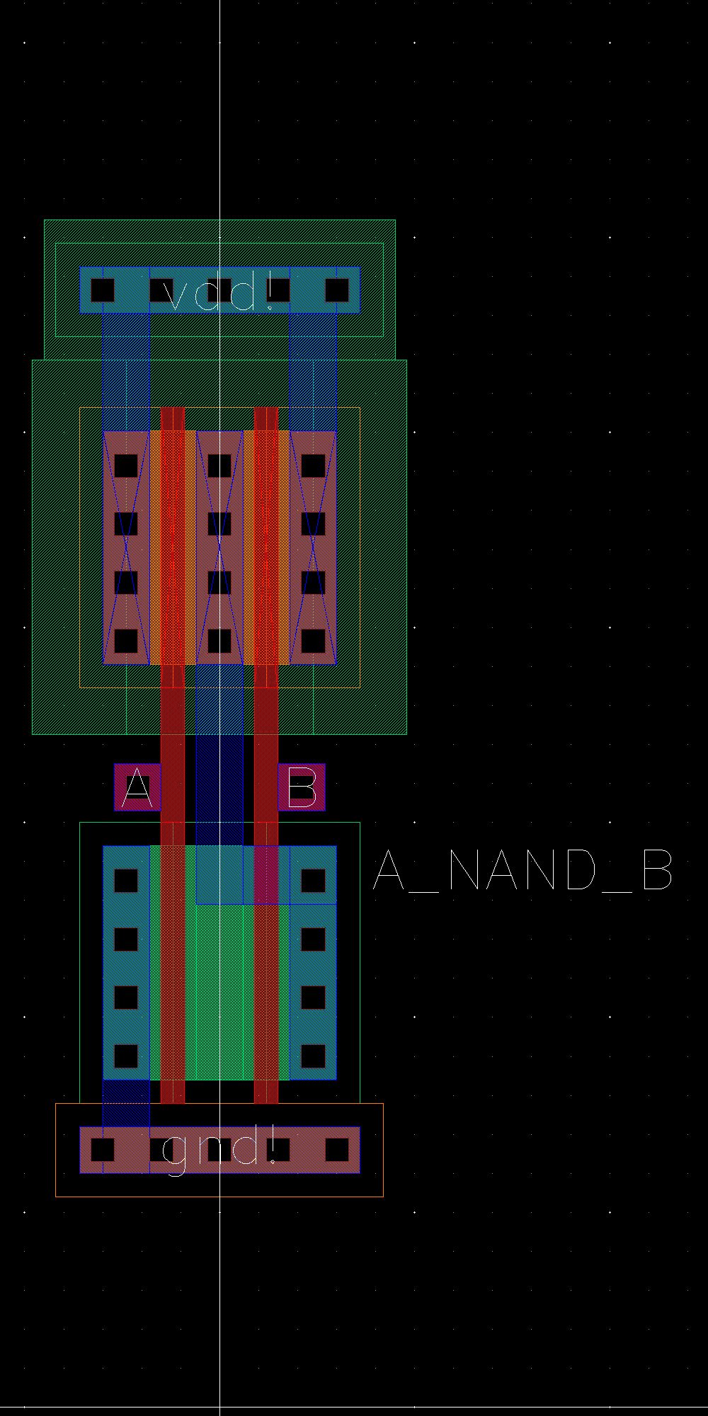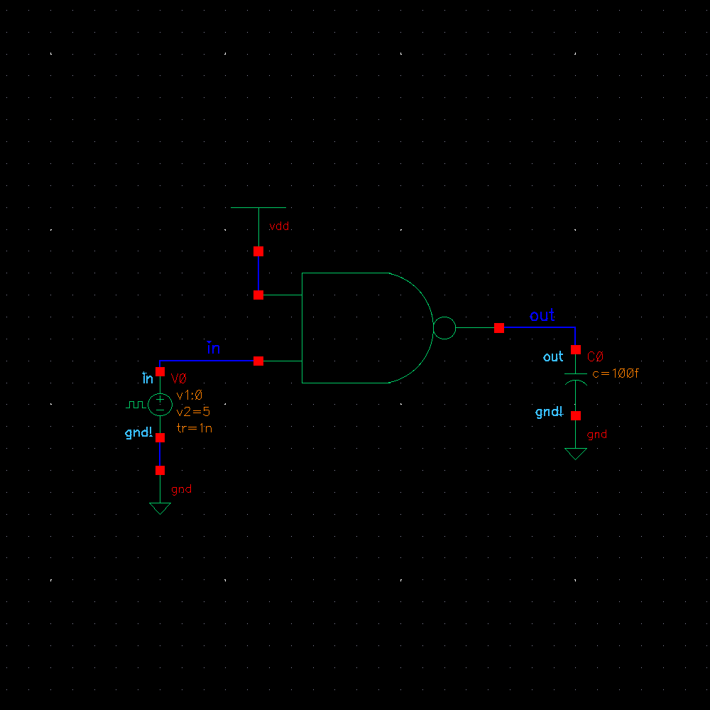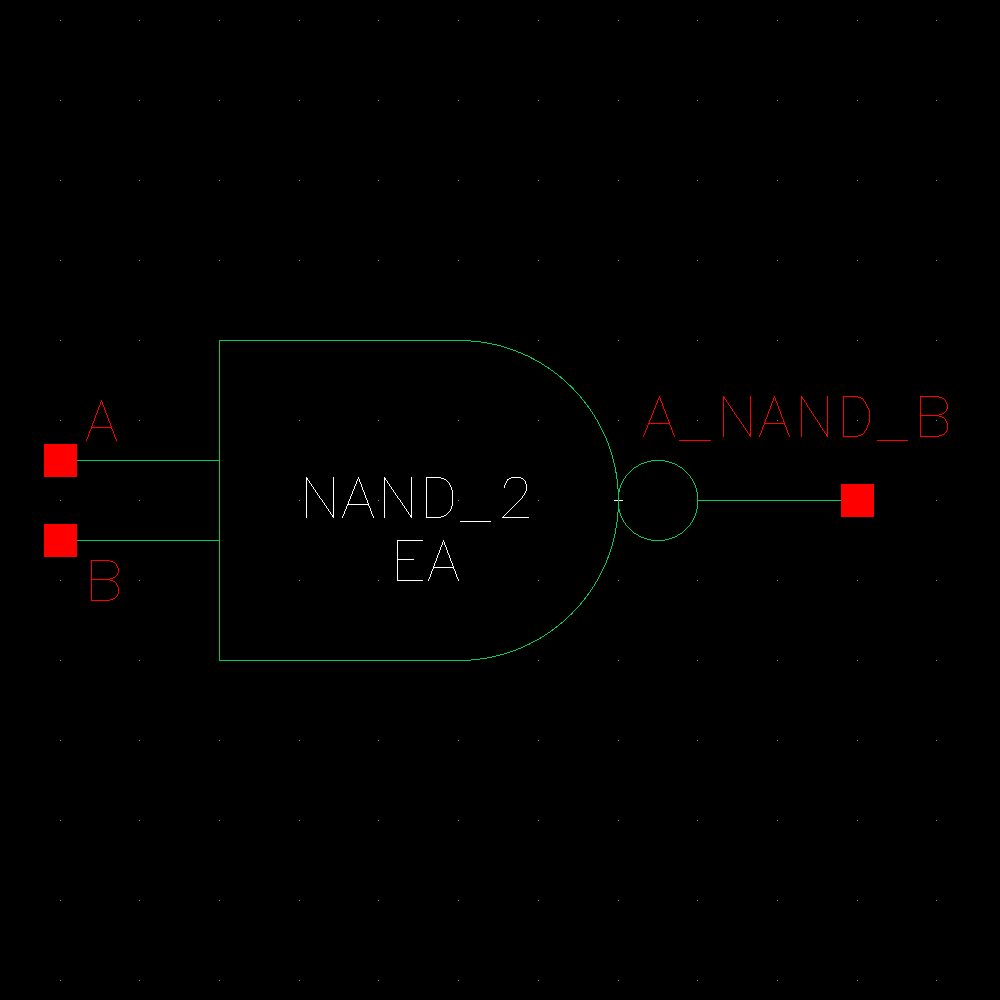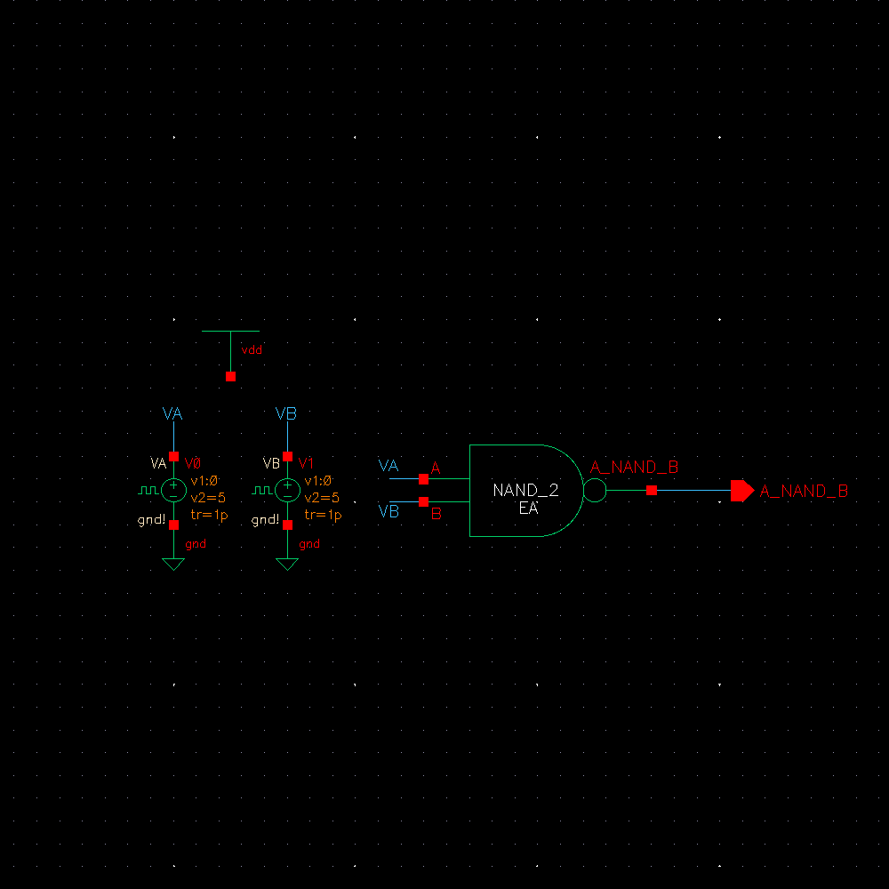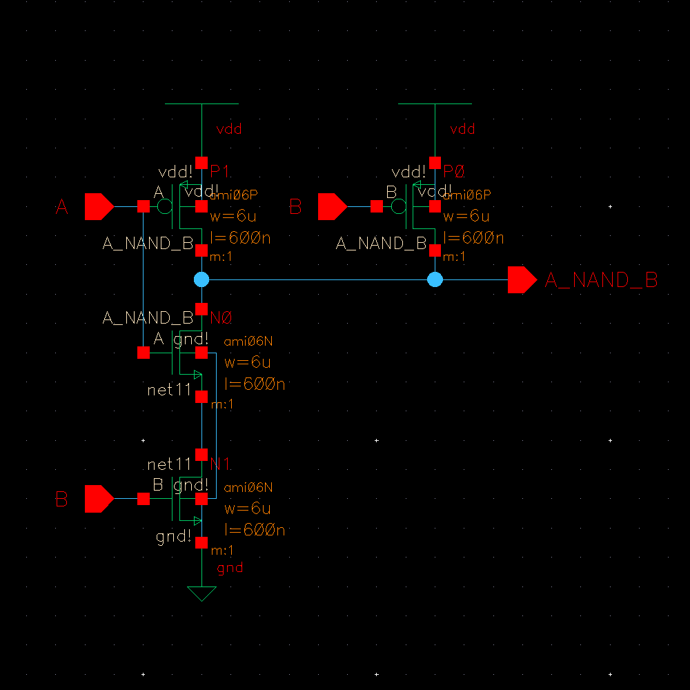 We start by drafting the schematic. A NAND gate is composed of 2 NMOS and 2 PMOS transistors.