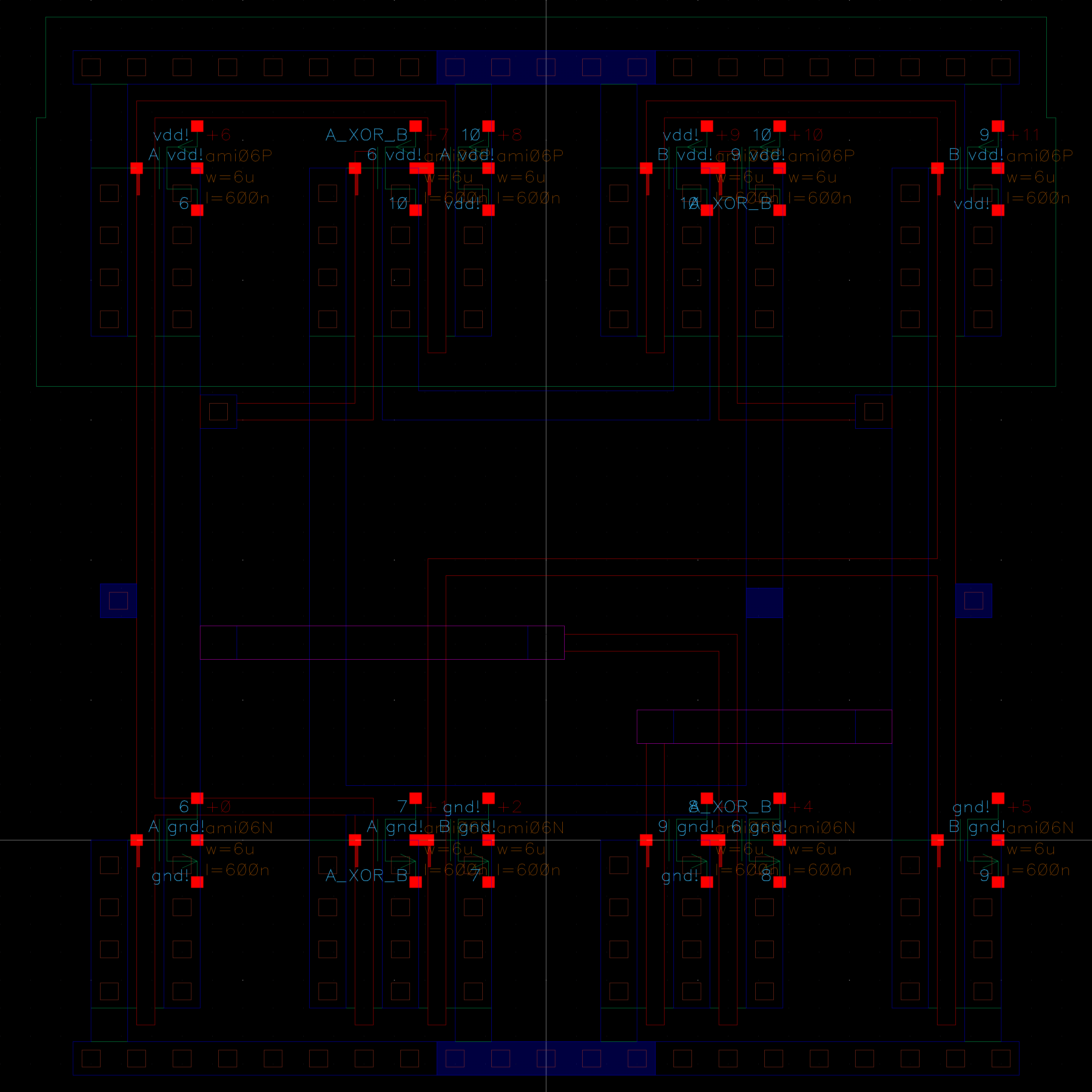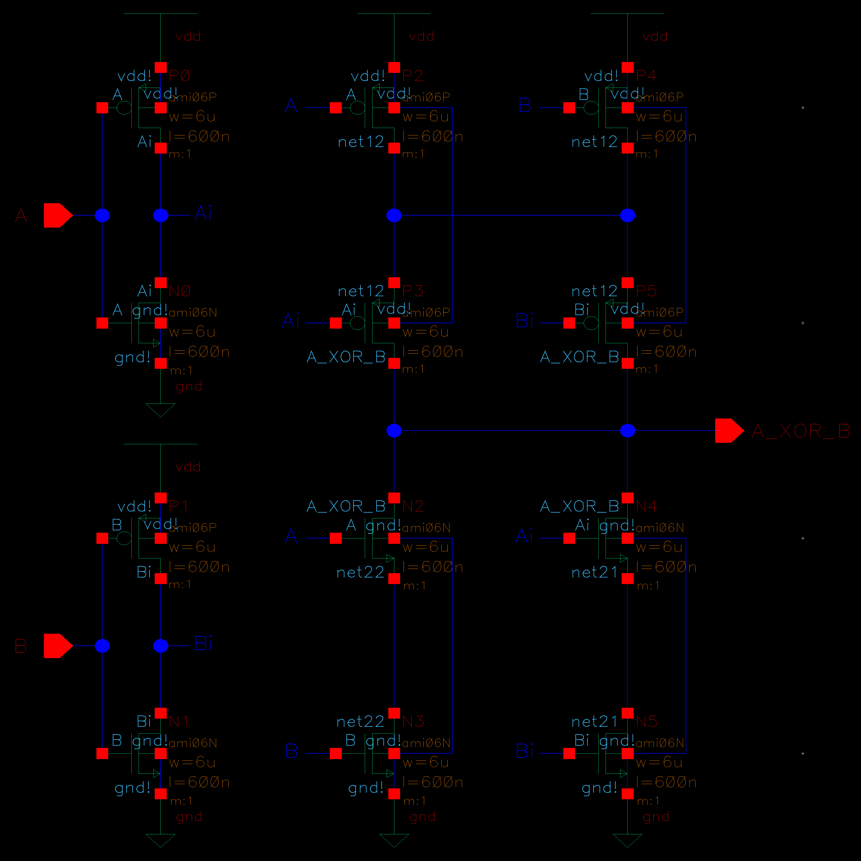 We start by drafting the schematic. A XOR gate is composed of 6 NMOS and 6 PMOS transistors.