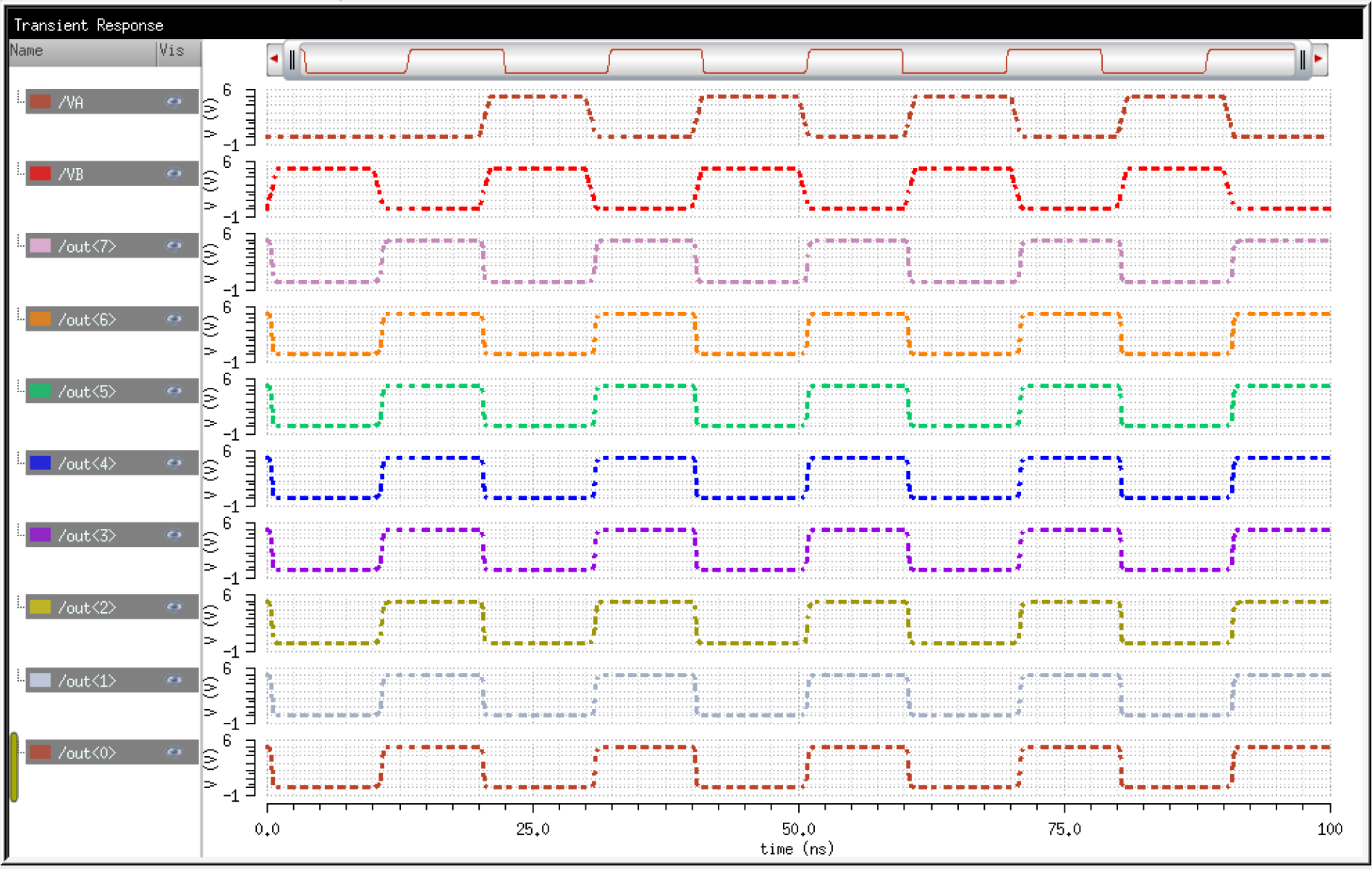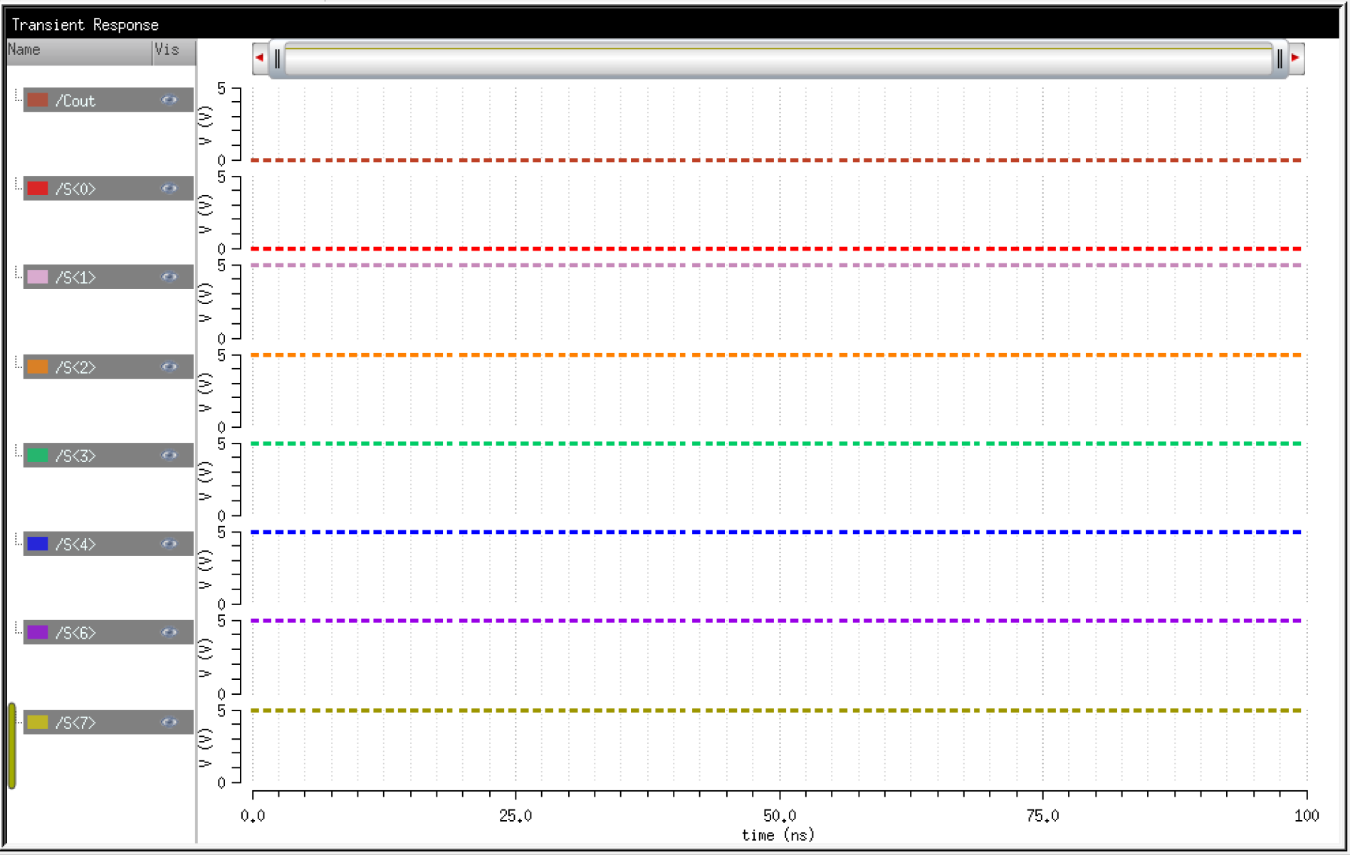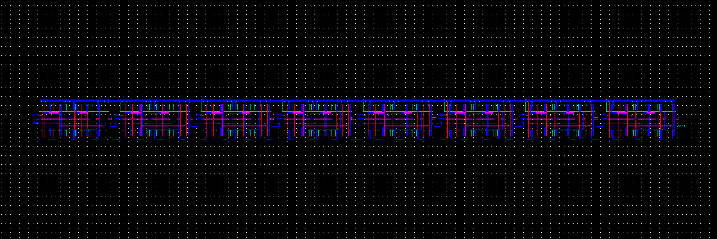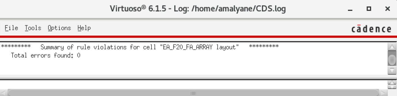 To verify the operation of my 8-bit Array FA, I added two numbers. In simulation paramters, I had A = 10111001 (185) + B = 01000101 (69) = 11111110 (254)