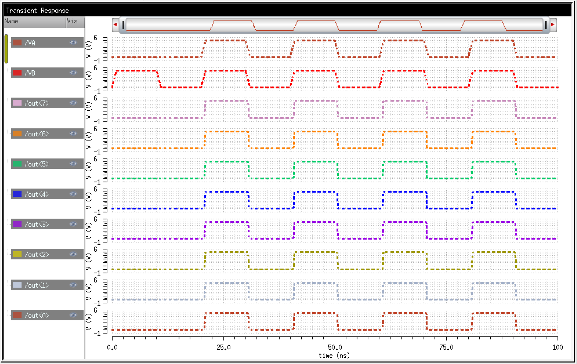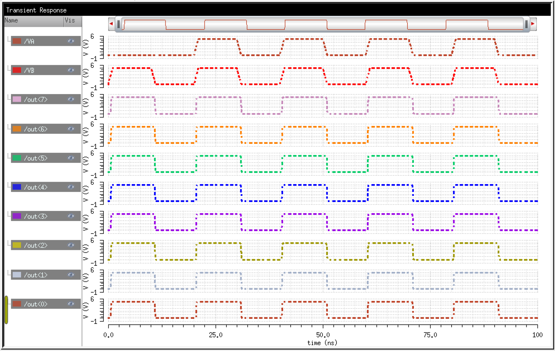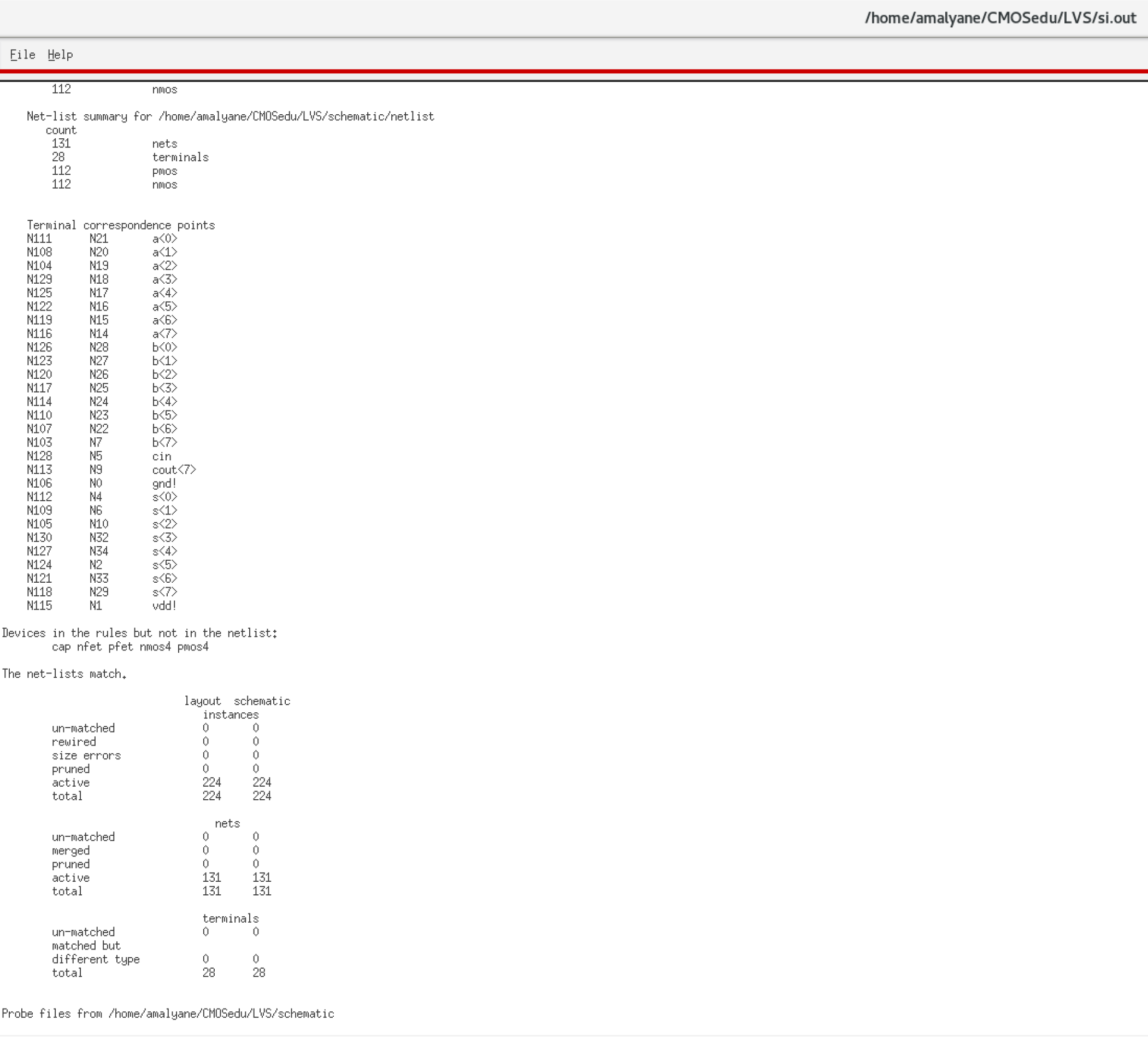 To verify the operation of my 8-bit Array FA, I added two numbers. In simulation paramters, I had A = 10111001 (185) + B = 01000101 (69) = 11111110 (254)