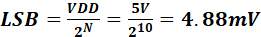 of bits (bit 0 to bit 9 make a total of 10 bits), and VDD is our input voltage,