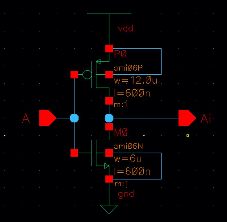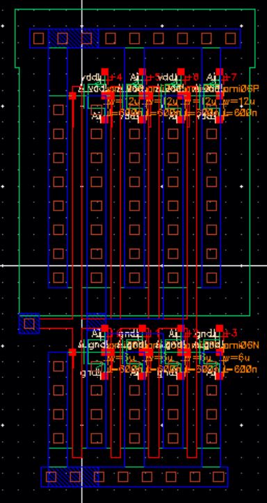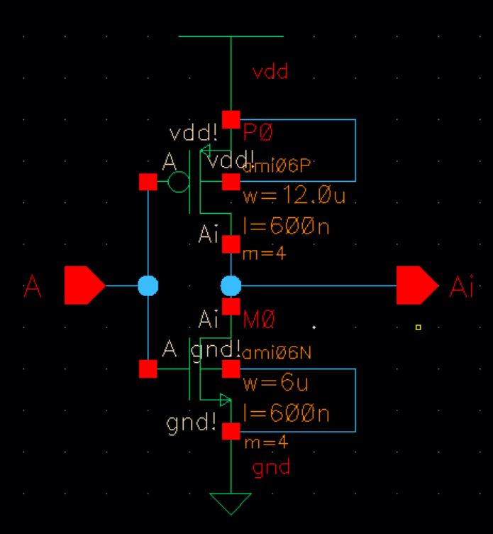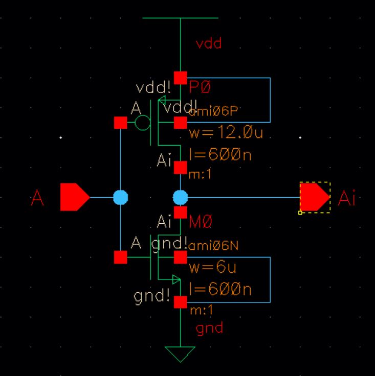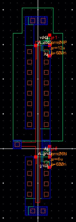 We start with the Schematic and layout of the 12u/0.6u inverter.