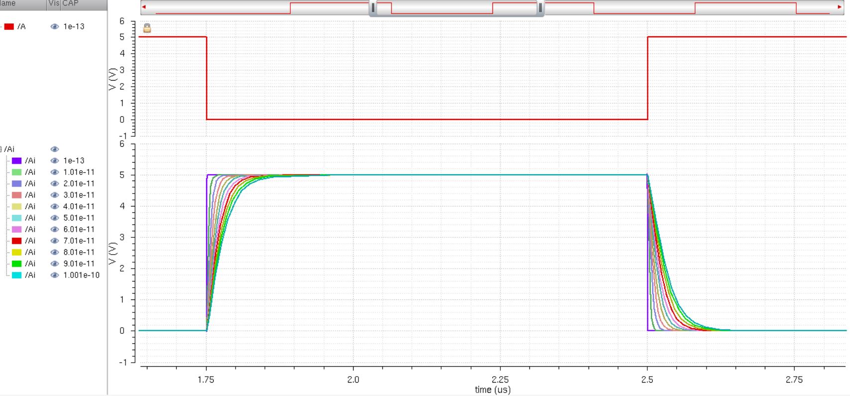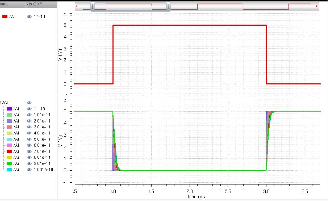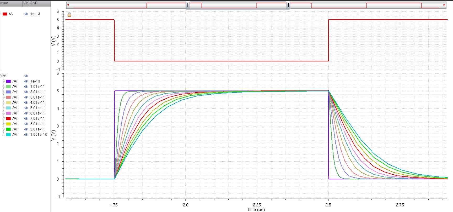 - Using SPICE simulate the operation of both of your inverters showing each driving a 100 fF, 1 pF, 10 pF, and 100 pF capacitive load
