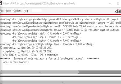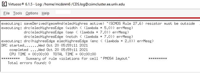 Both of the simulations for the VDS going from 0 to 5 and the simulations for the 1mV steps from 0 to 2 volts for both PMOS/NMOS required by the lab were done above as part of the prelab. Prior to the next part, we must confirm that the probe pad is constructed correctly, as well as any possible connection modules: