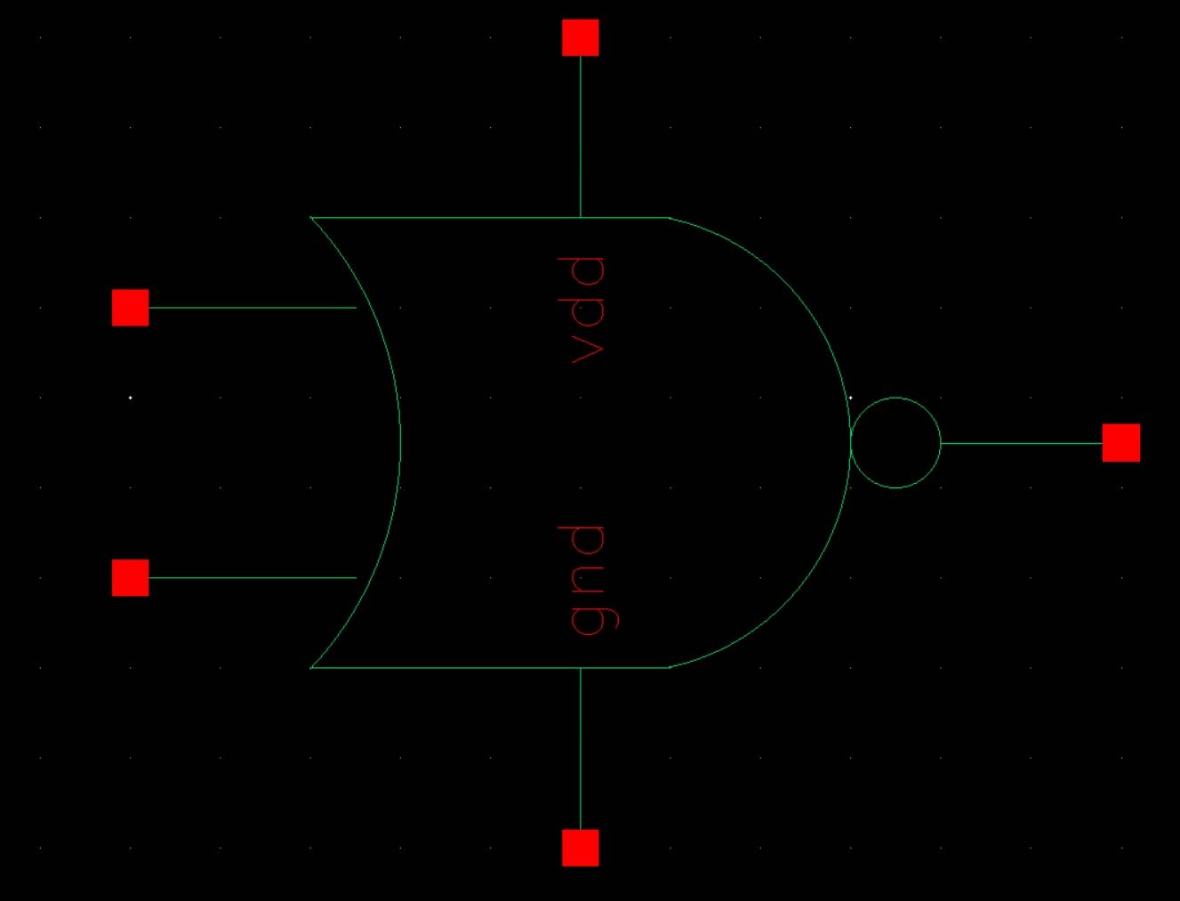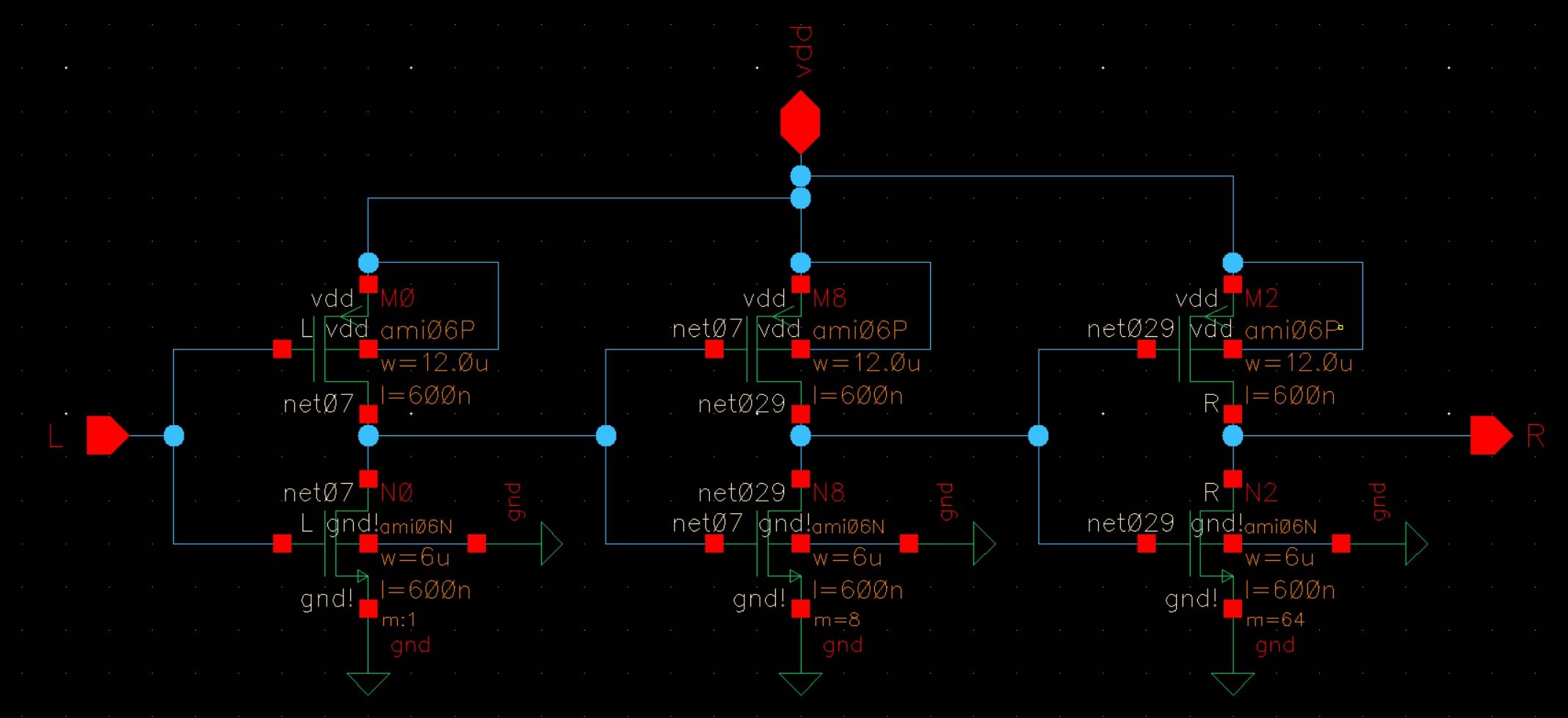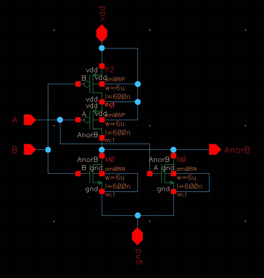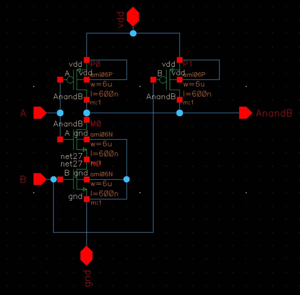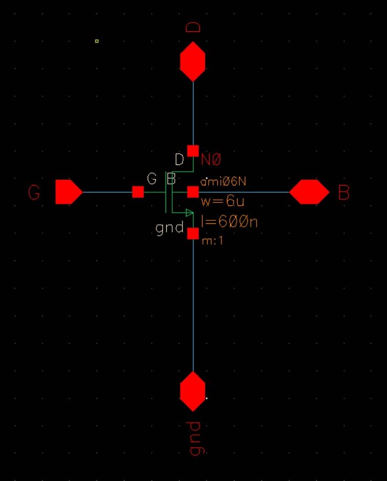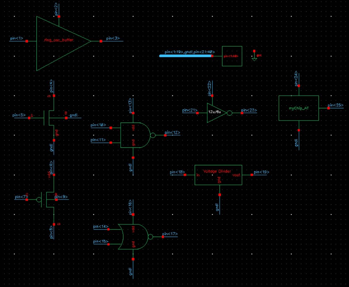 For the main portion of the lab, our group of 3 was tasked with putting several test structures onto a chip. Each test circuit was required to have its own power pin, so that a vdd!-gnd! short in one circuit would not make any of the other circtuits inoperable; however, they did all share a common ground pin (pin 20).